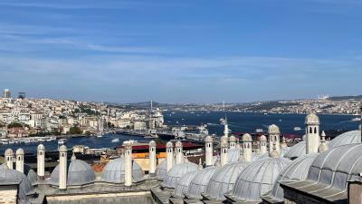 スレイマニエ・モスクに入る前に敷地内のテラスから絶景に釘付け。これを見るためだけでも価値があります。手前にドームが連なり奥には金角湾とガラタ橋、ボスポラス海峡、ガラタ塔などを臨む事が出来ます。