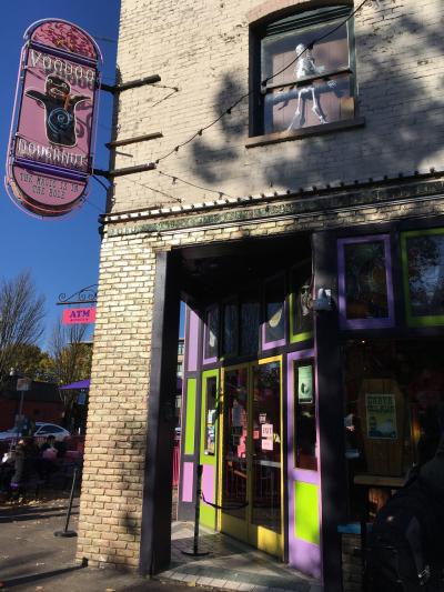 人気メニューのメープルベーコンとブードゥー人形のドーナツ、あとナッツぎっしりのドーナツを買いました。箱も可愛いです。メープルベーコンはベーコンの塩気とメープルの甘さが上手くあってて意外な味で人気あるのが納得です。ブードゥー人形は中に血に見立てた赤いジャムが入ってます。