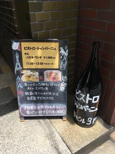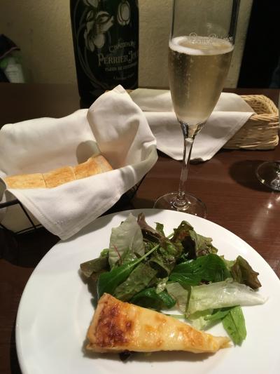 平日オープンとほぼ同時に入店、一番のりでした。ランチはパスタ2種類でキッシュとサラダ、お代わりできるパン、女性にはプチフィナンシェがつきます。そしてグラスシャンパンがワンコイン500円。食後のドリンク150円。とてもお得、せっかくなのでシャンパンもいただきました。