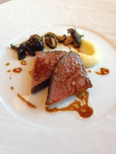 前菜はフォアグラ、お魚はサーモン、お肉は鹿児島産牛、お口直しのあと、タルトフロマージュのデザート、紅茶に小菓子。