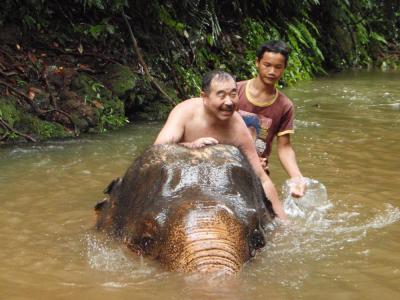 象にまたがり一緒に水浴びです。象さんの頭をコンコンと叩くと、思いっき...