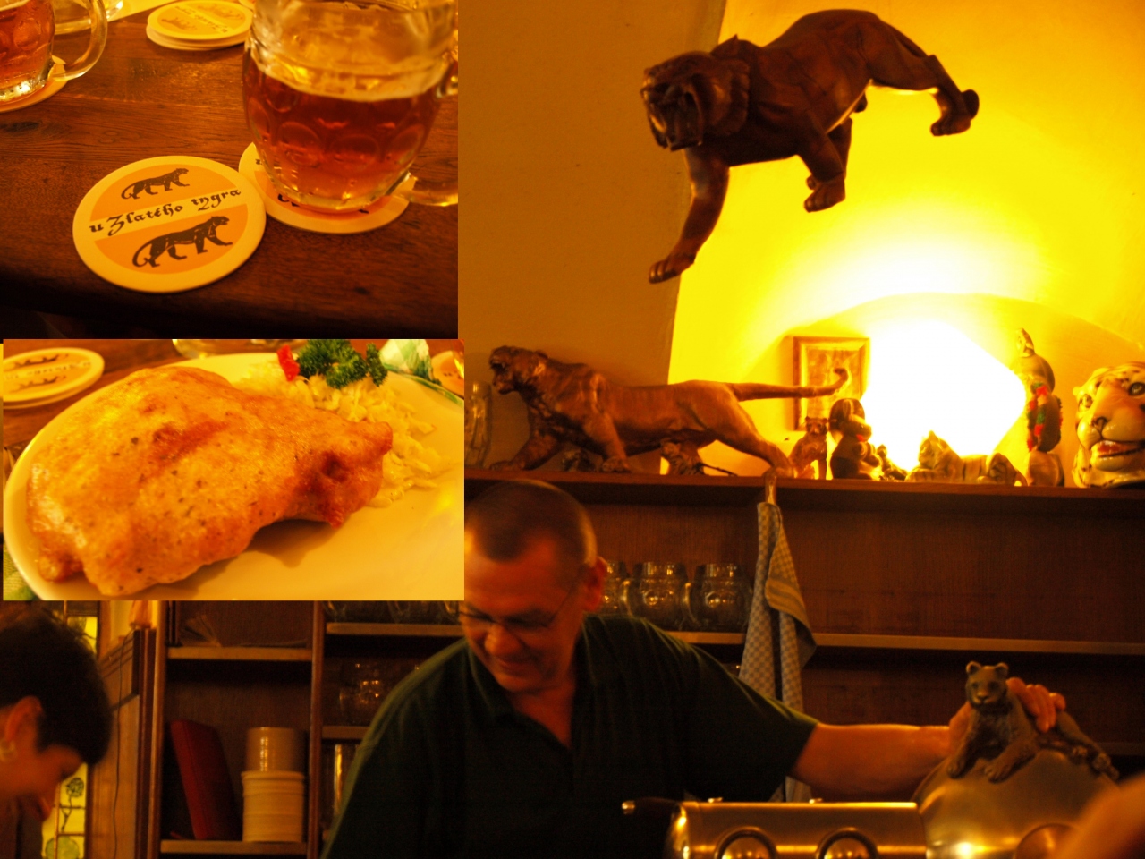 店名は『黄金の虎』という意味で、店内のあちこちに虎の置き物などがあります。適当にじゃんじゃん注いで、空のグラスがあると何も言わずともおかわりが置かれます。このビール、適当なのにすごくおいしい!! ビールが苦手な私でも、なんだか店のにぎやかな雰囲気で楽しく飲んでしまいました。