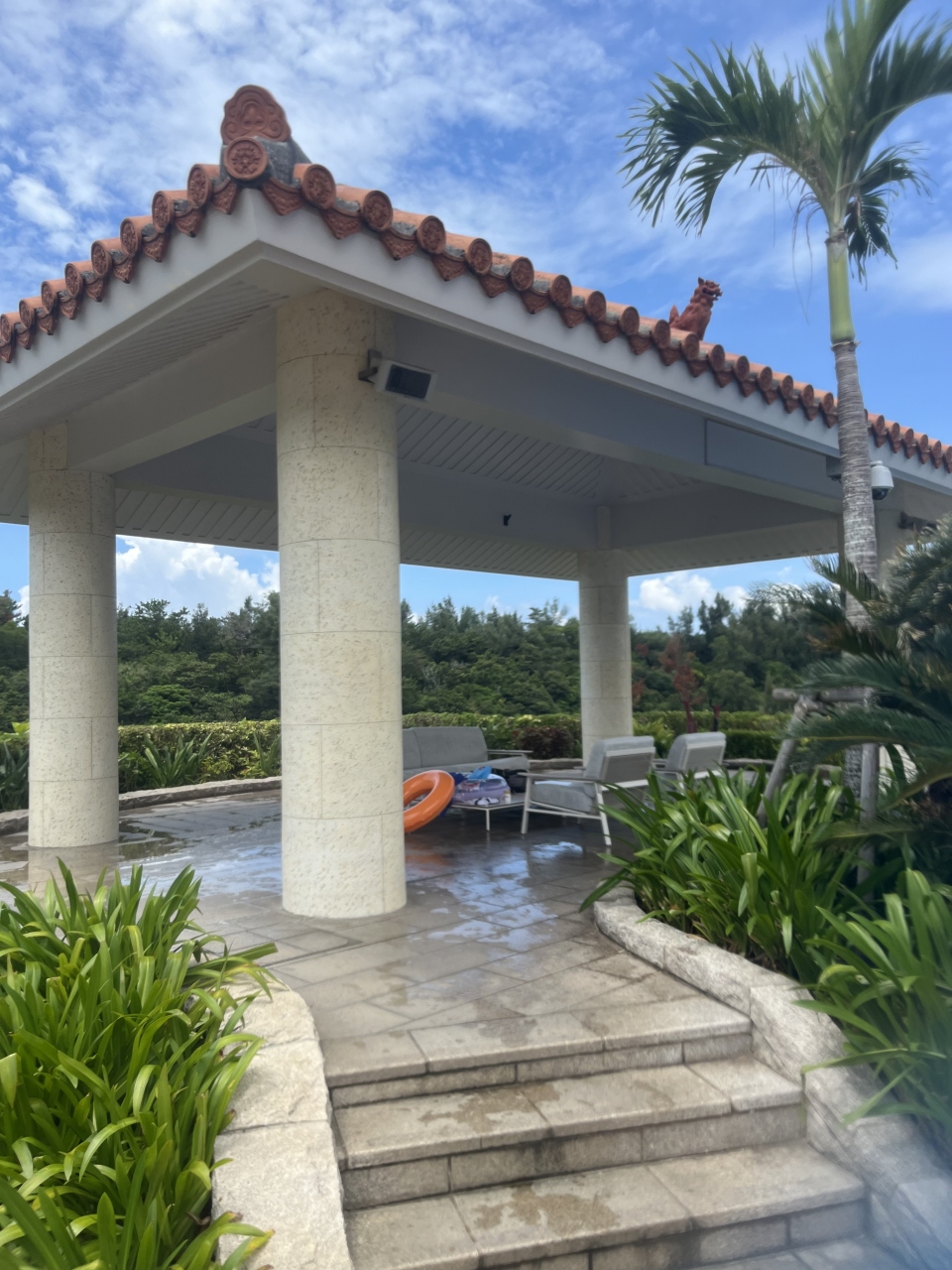 沖縄でも屈指の大きなプールがあります。また、本格的なスライダーもあり、子供達にも大人気です。プールサイドには無料のパラソルとテーブルがあり、ガバナは有料です。ジャグジーもあり、屋根とソファのあるスペース(無料)もあり、リゾート間満載です。