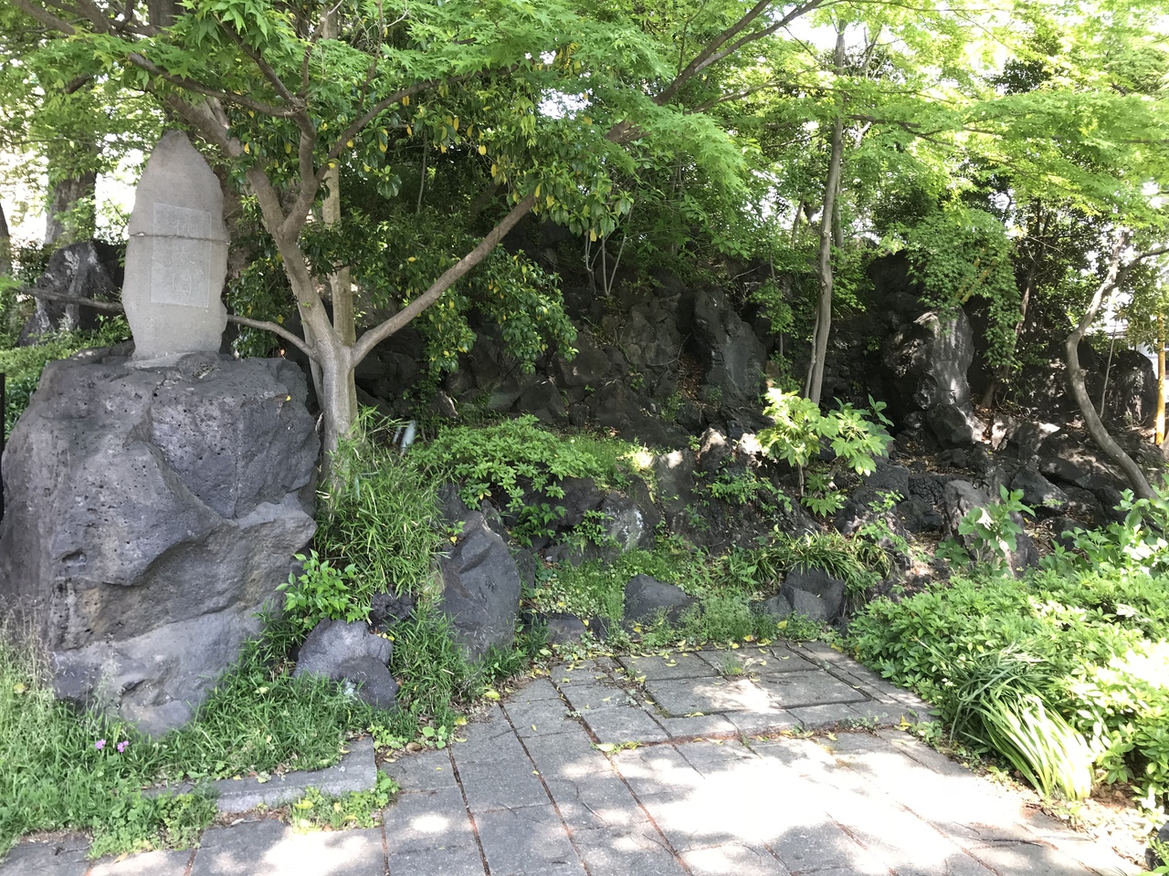 三島神社の別当職を務めた愛染院という大寺院の跡だそうです。あまり大きくはなく、見てもそこに寺院あったとはよくわかりません。溶岩の跡があるくらいで、正直見ても案内板がなければ何が何だかわからない場所です。