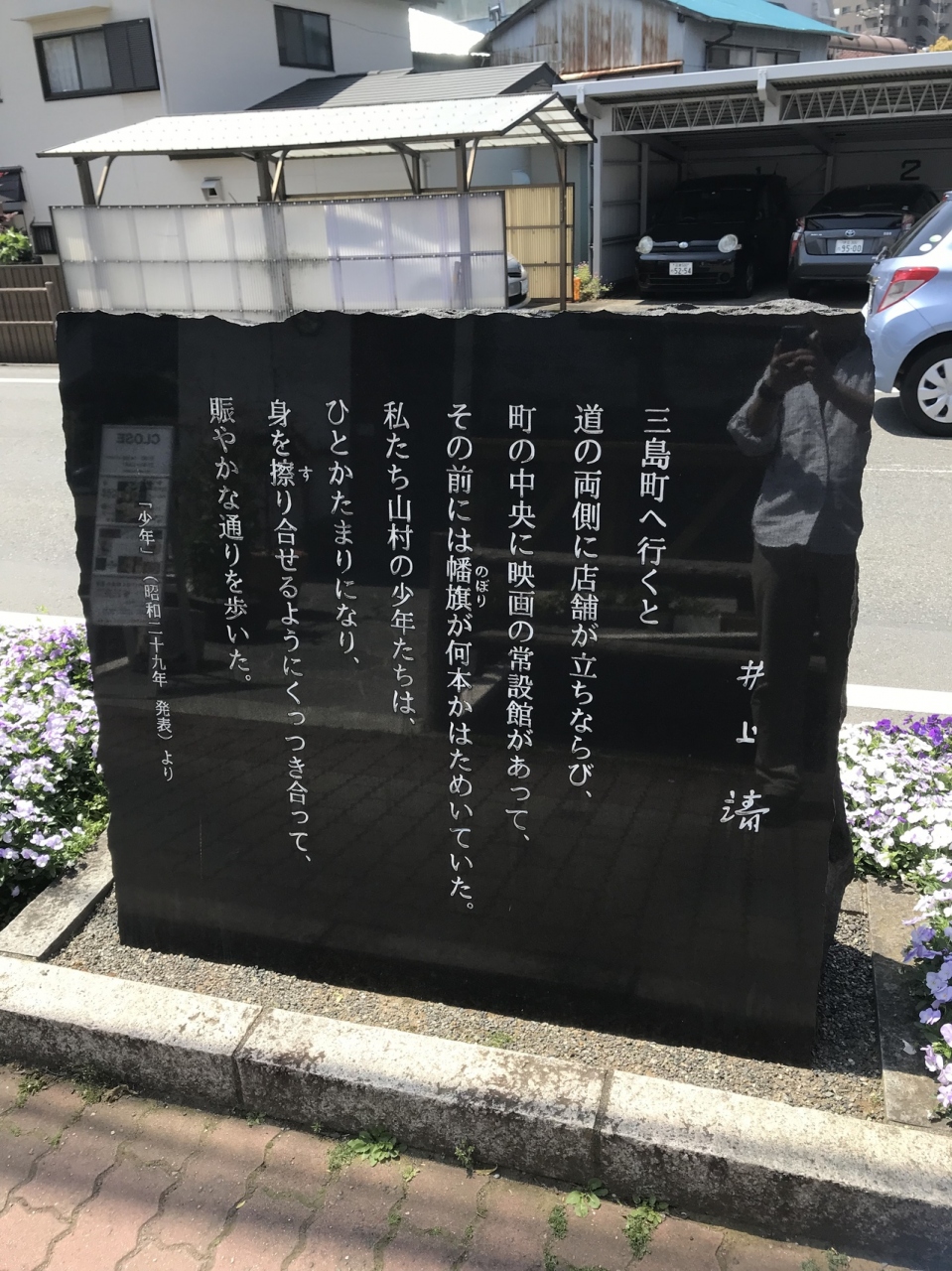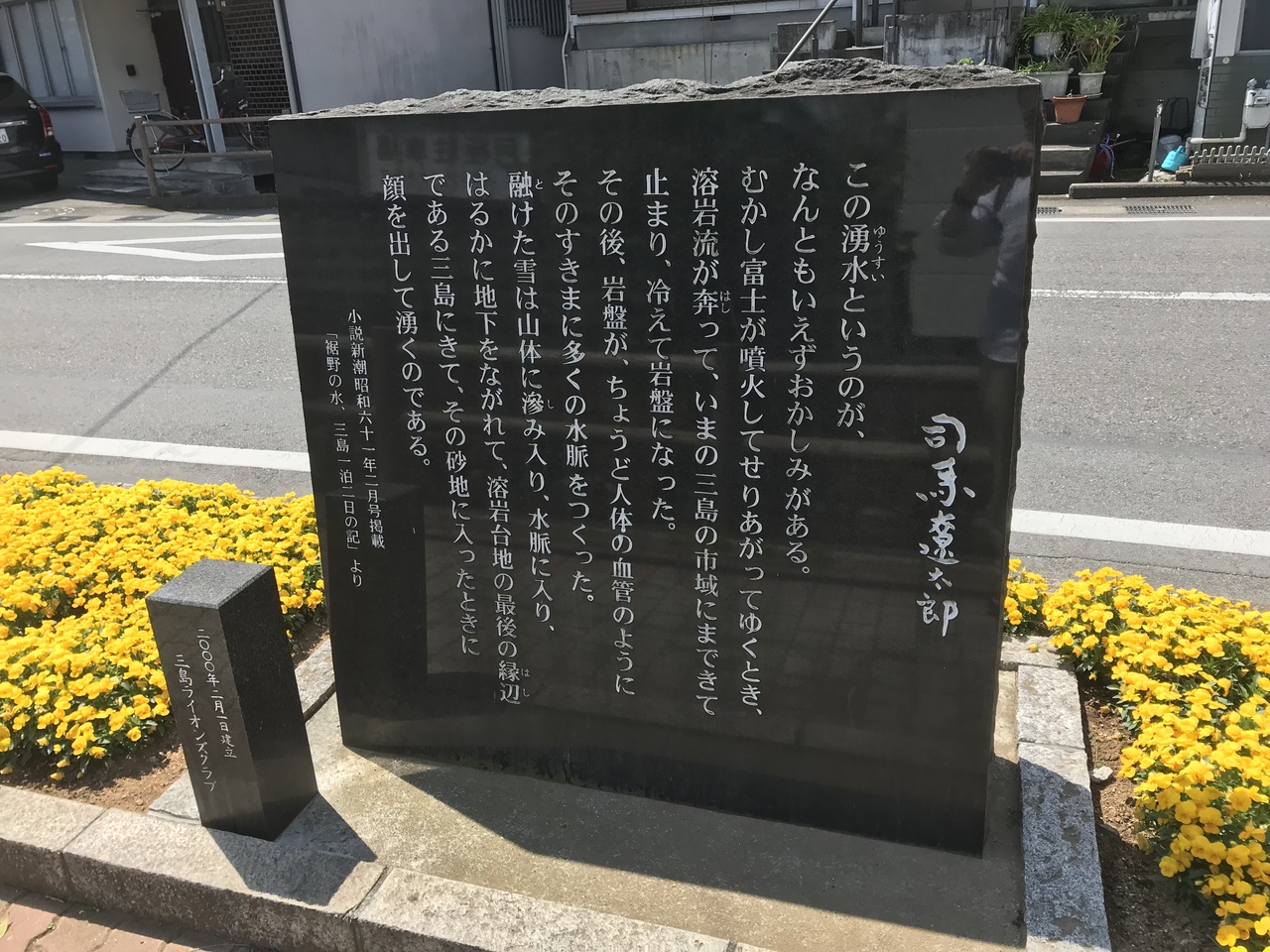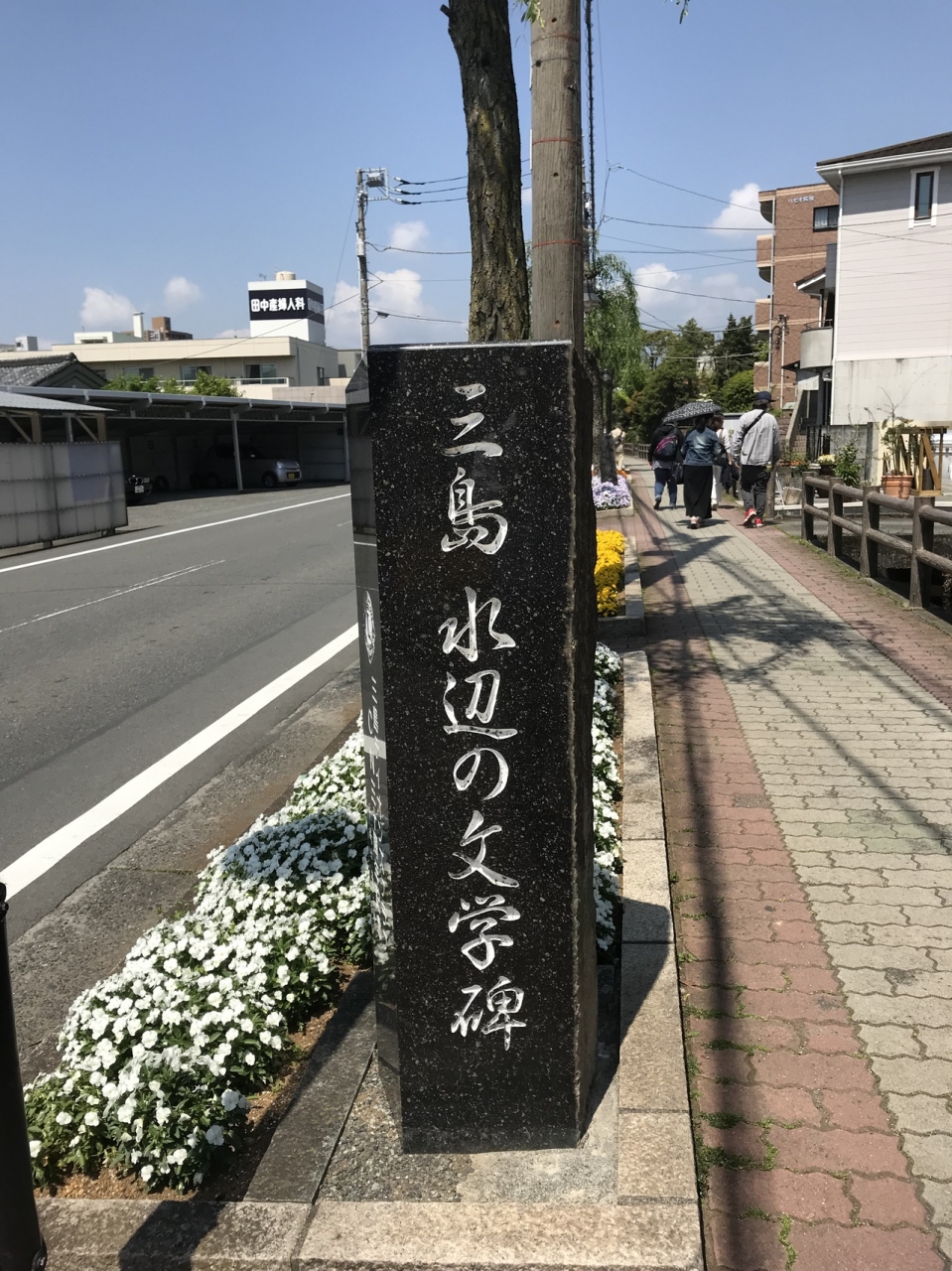 三島大社のそばから白滝公園の川までの間に、歌碑が並んでいます。よく見ると司馬遼太郎や井上靖など有名な人の歌碑でした。川沿いに等間隔に立っており文学の好きな人にはなじみのある名前がたくさん出てきます。三島大社側から川をさかのぼっていくコースがおすすめです。