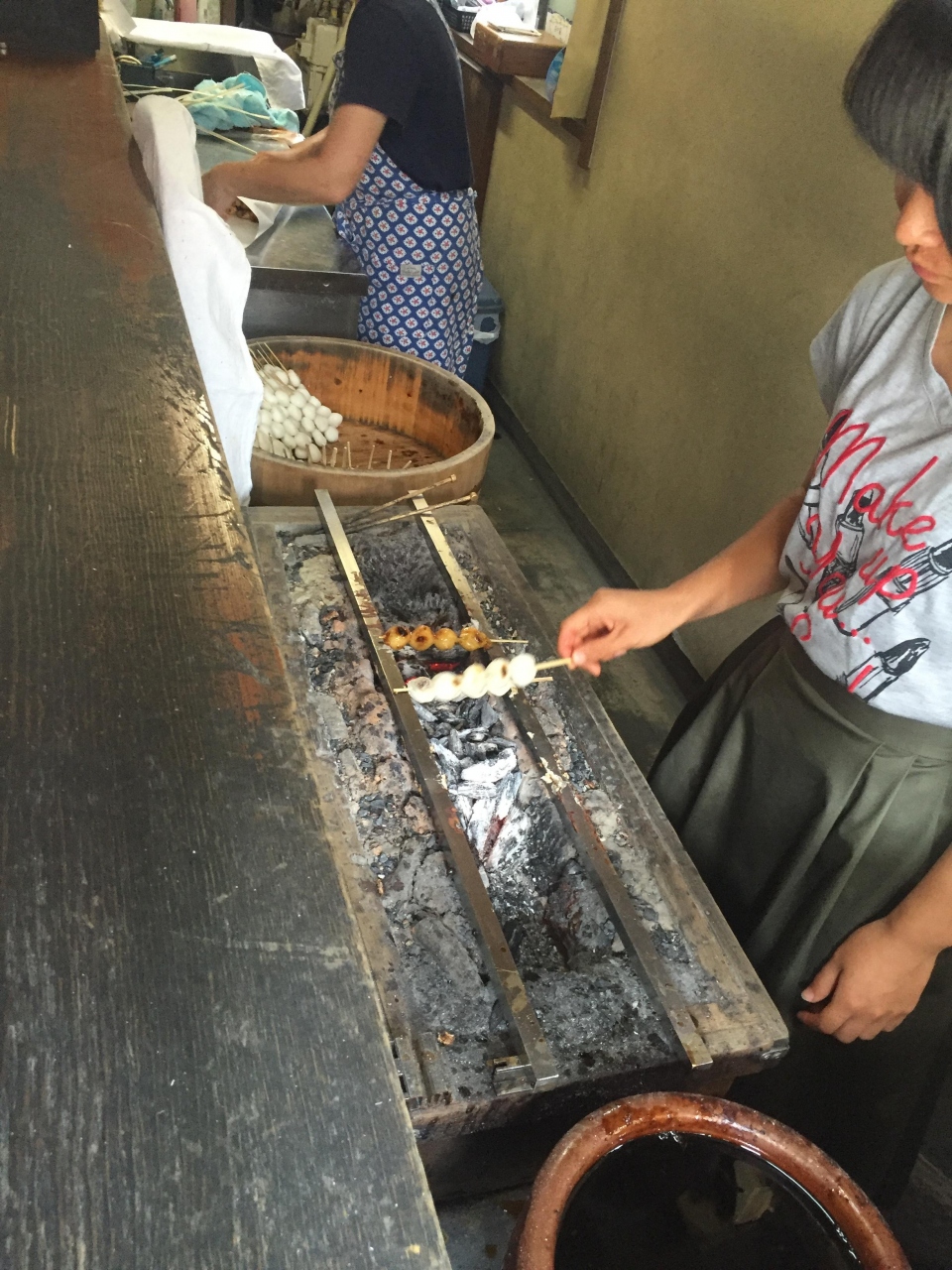 時の鐘の下にある団子屋さんです。昔風の作りで、店内には、カウンターの内側で炭火で焼く台があるだけで、殺風景ですが、これがかえって良い!炭火でこんがり焼いた醤油団子1本60円です。焦げた醤油の匂いがたまりません。派手さは全くないですが、かなり大好きな味と店です。お勧めです。