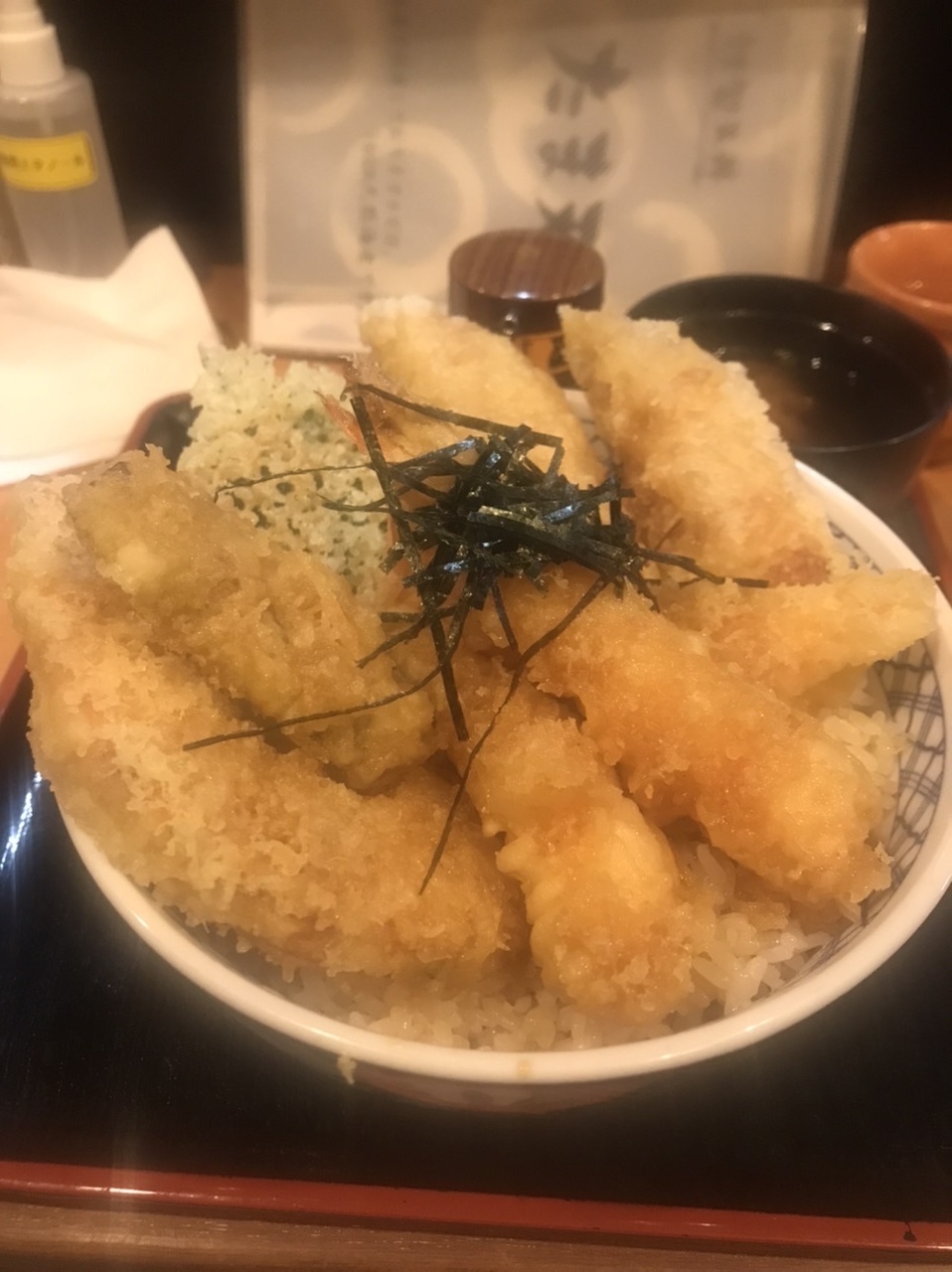 天丼1000円を大盛り50円増しで注文。えび3匹、野菜天、揚げ玉子が載っています。玉子天はちくわに変更も可能。味噌汁と漬物が付きます。他にもイカ・えび天丼やホタテとえびの天丼など、種類は豊富です。サクサクの天ぷらで、胸焼けすることもなく美味しくいただきました。カウンターのみ7席です。12時前にはいっぱいになります。