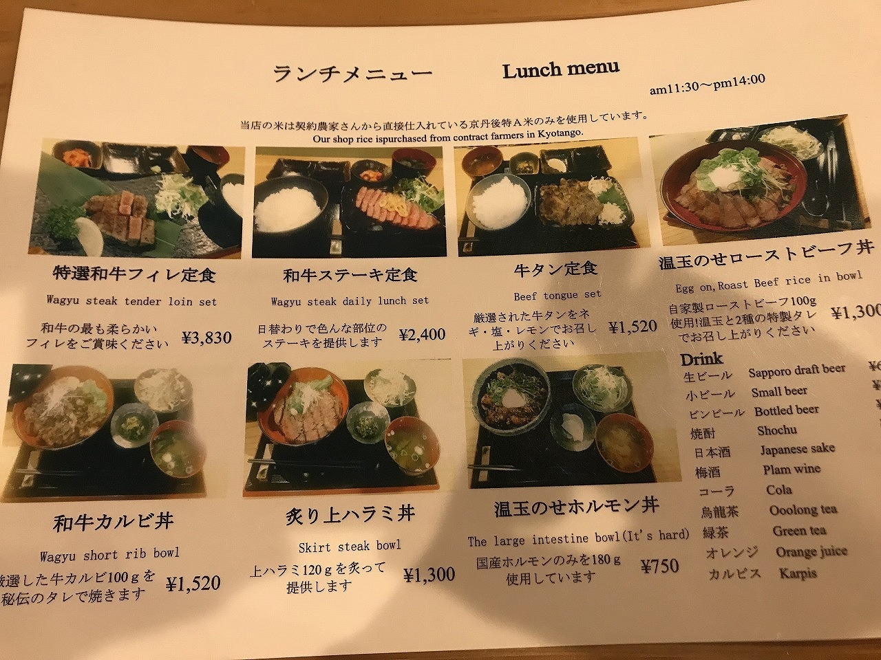 京阪七条駅を上ったところにある焼肉屋さんです。ランチで利用。温玉のせローストビーフ丼1300円、炙りハラミ丼1300円、和牛カルビ丼1520円を注文。肉は柔らかくておいし。カルビ丼は焼肉丼みたいなので、炙りハラミ丼が一番美味しかった、Wi-Fi使えます。