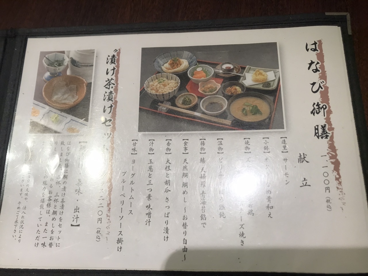 JR福島駅近くにある鯛めしの店です。ランチで利用。昼ははなび御膳1100円のみ。220円増しで鯛茶漬けセットが付きます。ご飯はおかわり自由です。小鉢や刺身、麺などもあり、お手頃価格で上品なな御膳です。駐車場ありません。