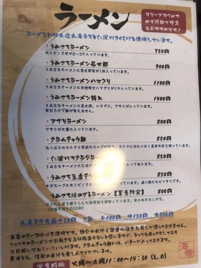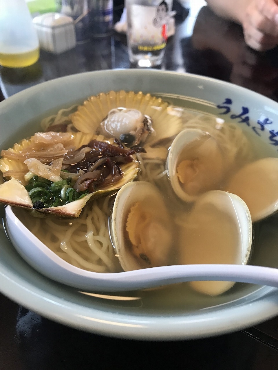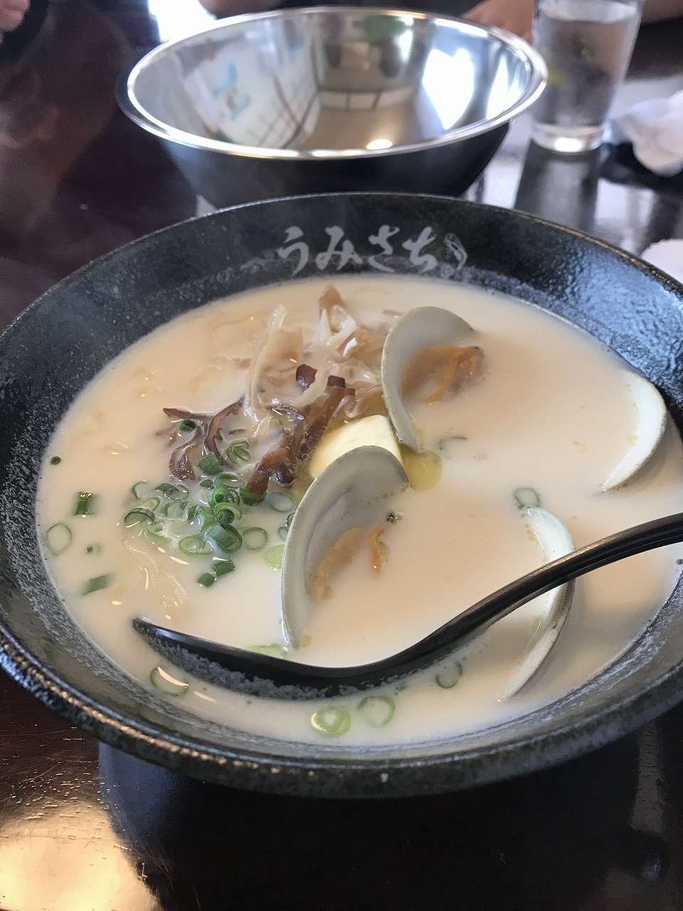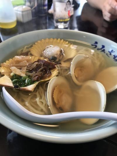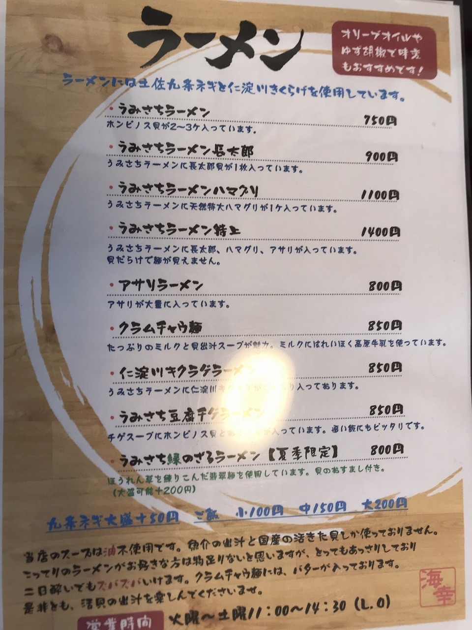 高知市にあるラーメンと貝焼きの店です。貝がたっぷり入ったラーメンが有名で食べに来ました。14:00頃来店しましたが、かなり混んでいました。うみさちラーメン、うみさち長太郎ラーメン、クラムチャウ麺、仁淀川キクラゲラーメンを注文。基本的に蛤みたいなホンビノス貝が2個入っています。どれも貝の味がしっかりしていて美味しい!貝だけで出汁を取っているそうです。一番美味しいのはクラムチャウ麺。味が一番濃厚で、かなりオススメ。キクラゲラーメンはうみさちラーメンのキクラゲが多い版です。全部で3350円。人気店なのが納得です。駐車場は4台分しかありません。