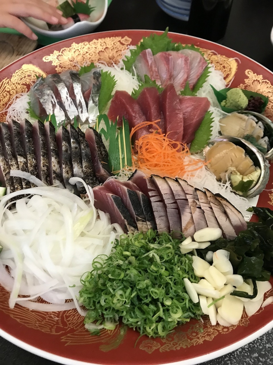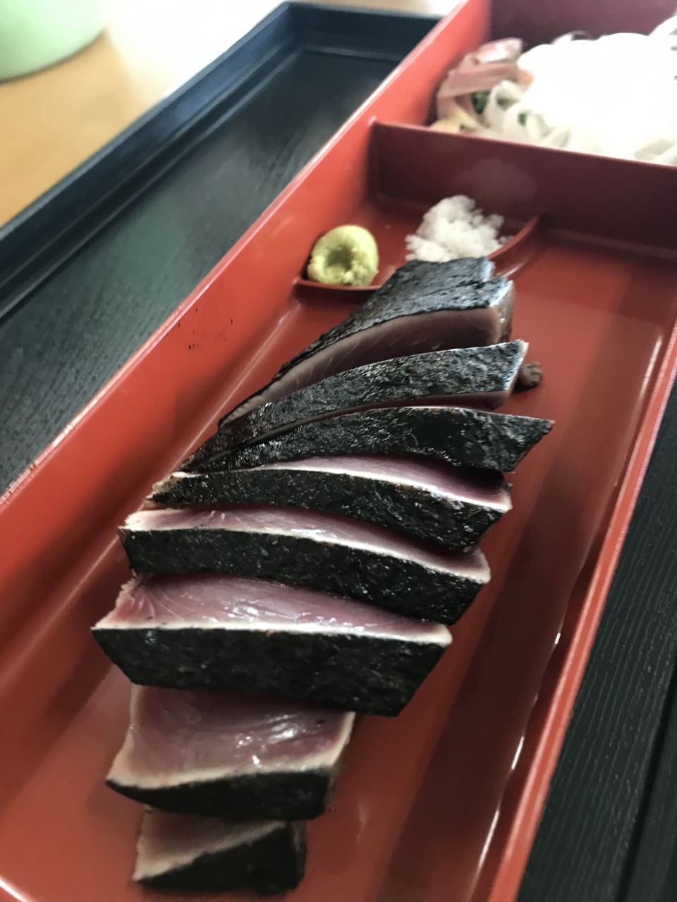 坂本龍馬像で有名な桂浜近くにある店です。ここでは、自分で焼いたカツオのタタキが食べられます。カツオ一塊で1300円(単品)で、串に刺されたカツオを藁の火で焼きます。子供も、大人も楽しめます。焼いた後、切ってもらって、ポン酢や塩で食べます。初めて塩で食べましたが、美味い!ポン酢より塩が美味しいし、焼きたてなので、藁の焦げた風味が際立って美味しかったです。