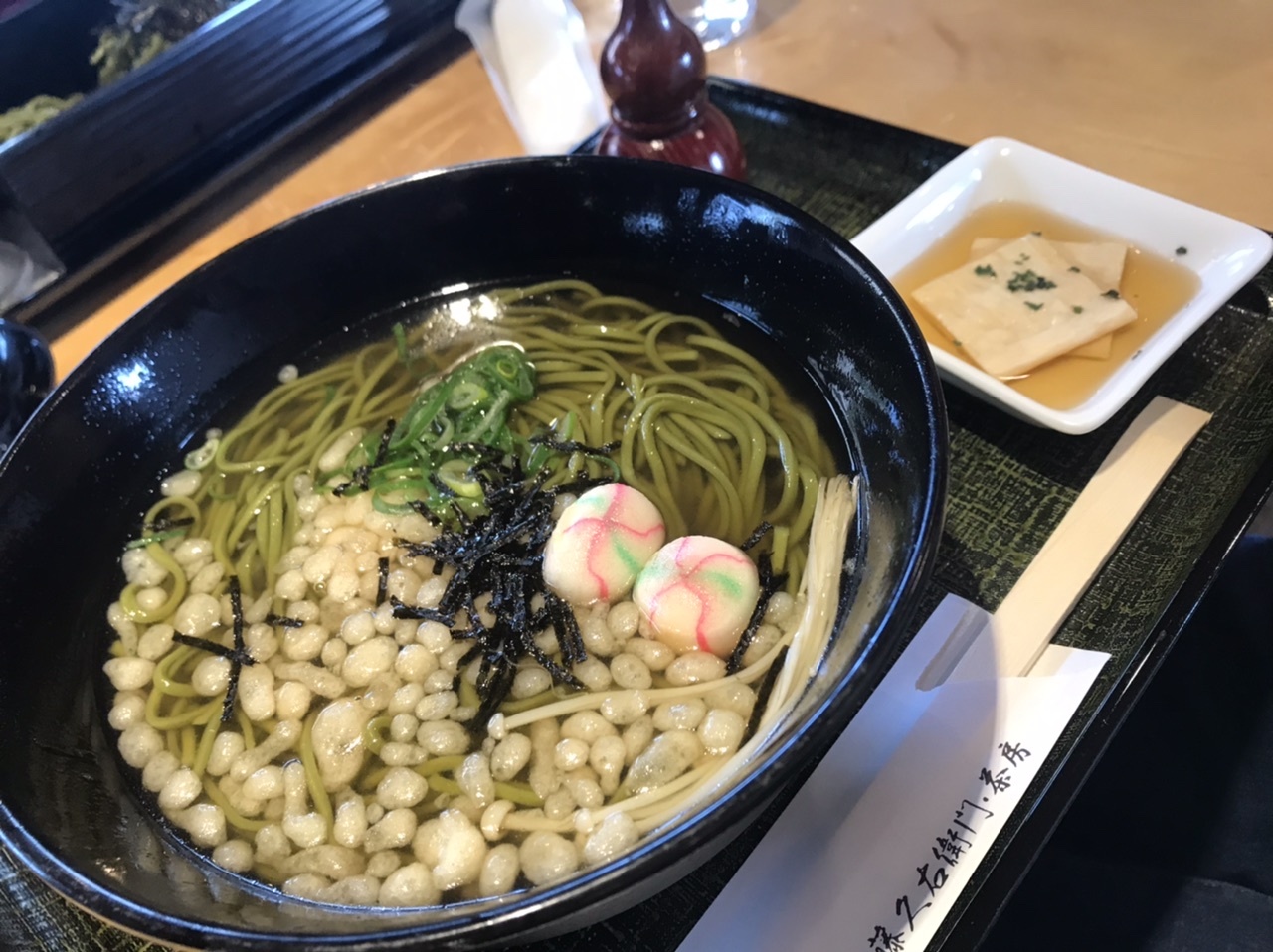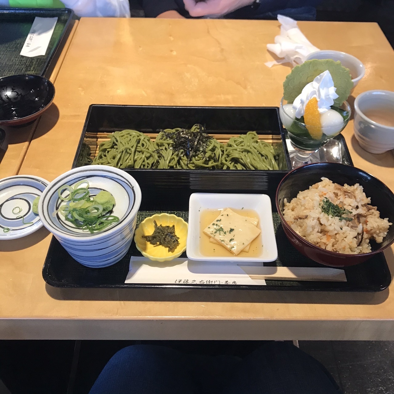 京都の宇治にある店です。お茶で有名な伊藤久右衛門本ですが、ここでは茶蕎麦などが食べられます。にしんそば1090円を大盛りで210円増しと抹茶そばセット1490円を注文。ゆば、かやくご飯、ミニパフェが付きます。お茶の葉の佃煮など、ちょっと変わった一品もあります。特に茶の味が濃いとかはないですが、京都らしい風情が味わえる店です。