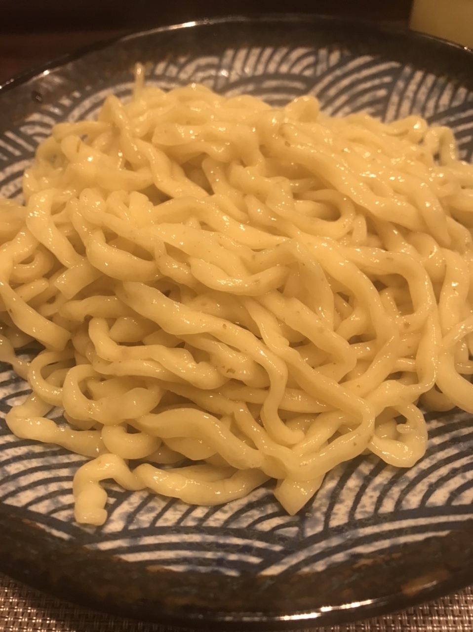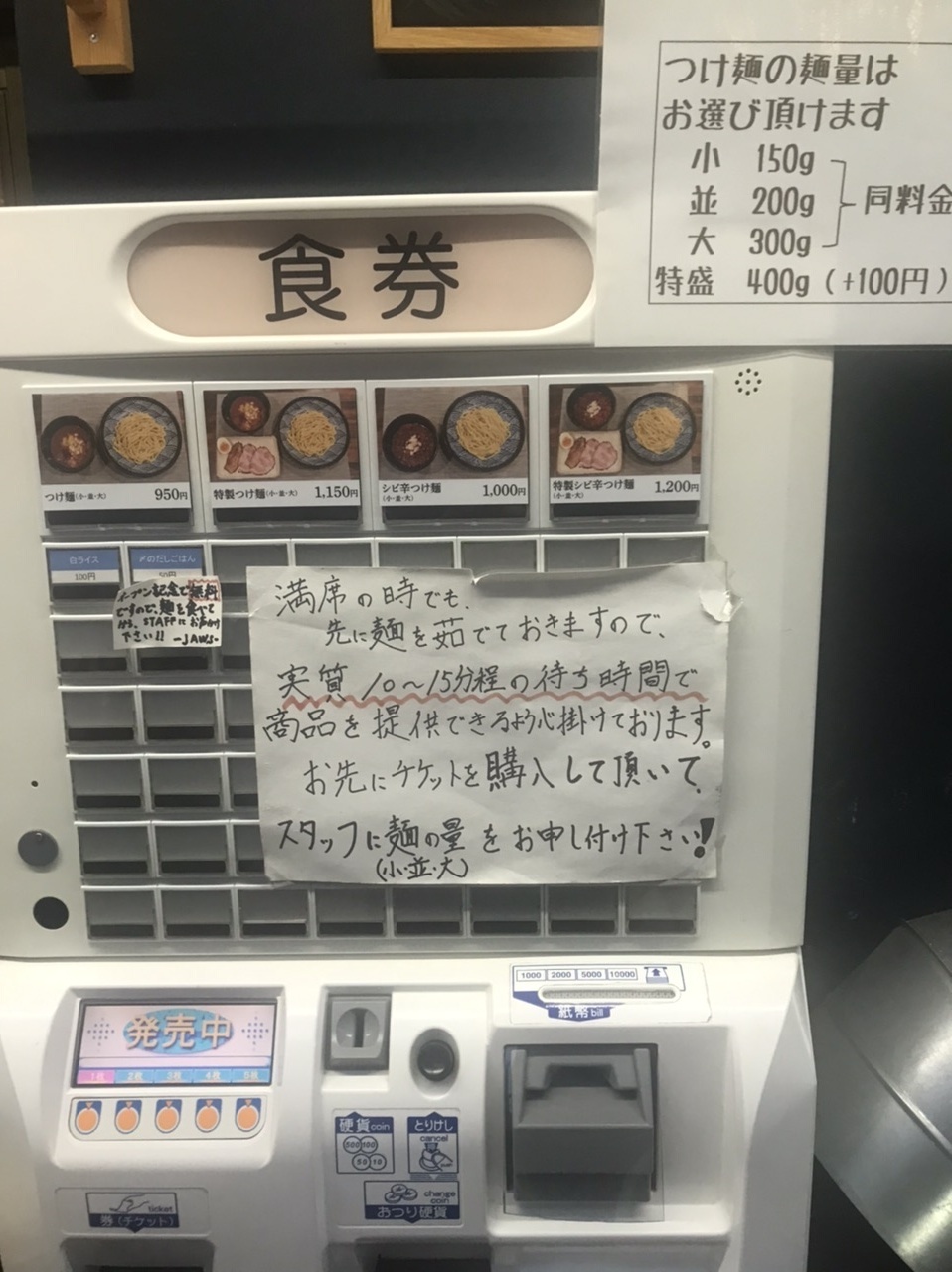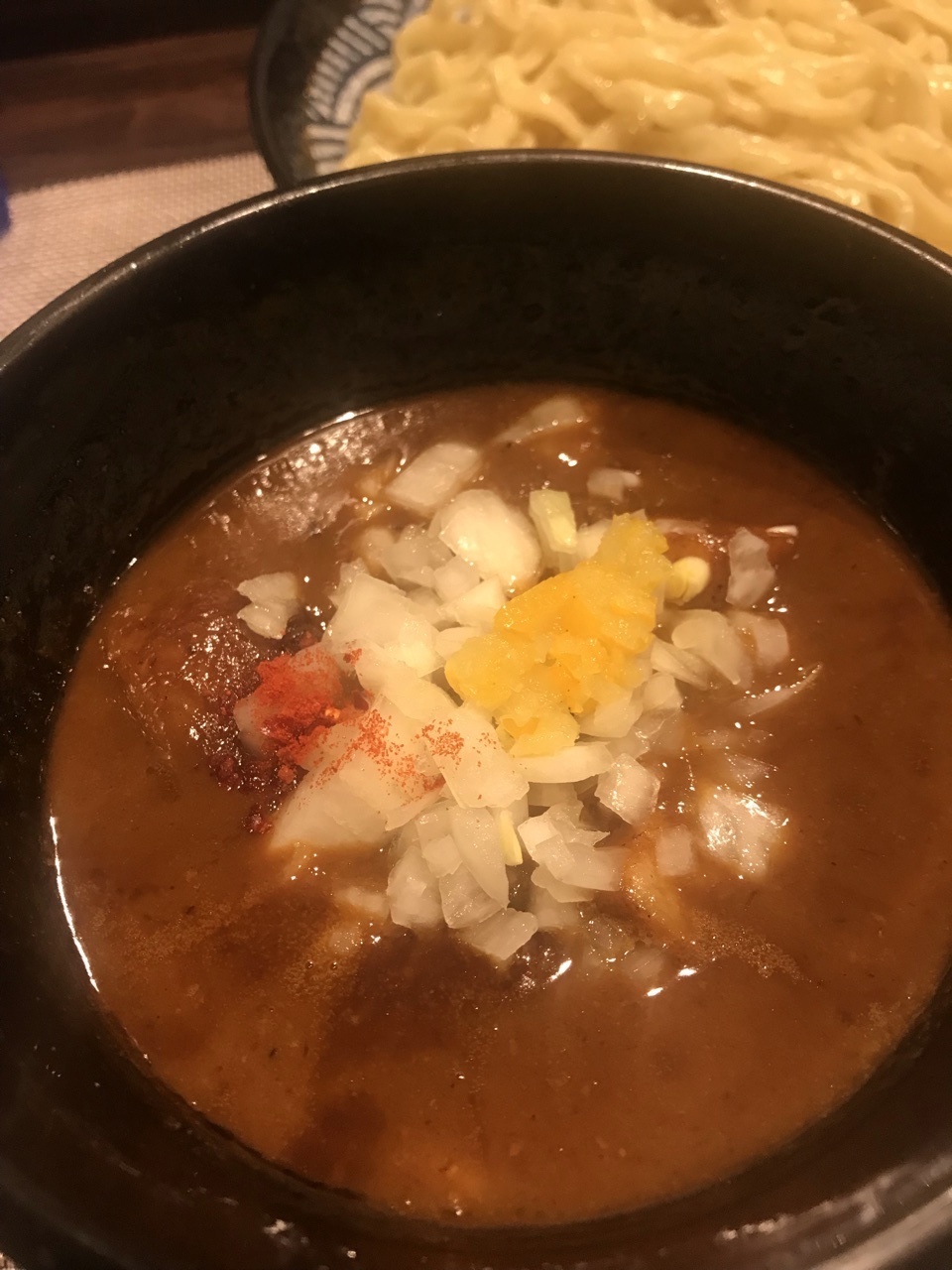 つけ麺950円を熱盛りで注文。ここは大も同じ料金です。本店と違い、麺が平打ち麺です。スープは刻み玉ねぎ、角切りチャーシュー、メンマが入っている。鶏ガラ、豚骨、鯖節を煮込んだ、超濃厚スープです。本店のつけ麺とは完全に別物。個人の好みにもよるだろうが、本店のつけ麺には遠く及ばない。すだち酢をかけて食べれます。また、締めの出汁ごはんは本店と同じく無料です。カウンター席のみ6席。駐車場はありません。