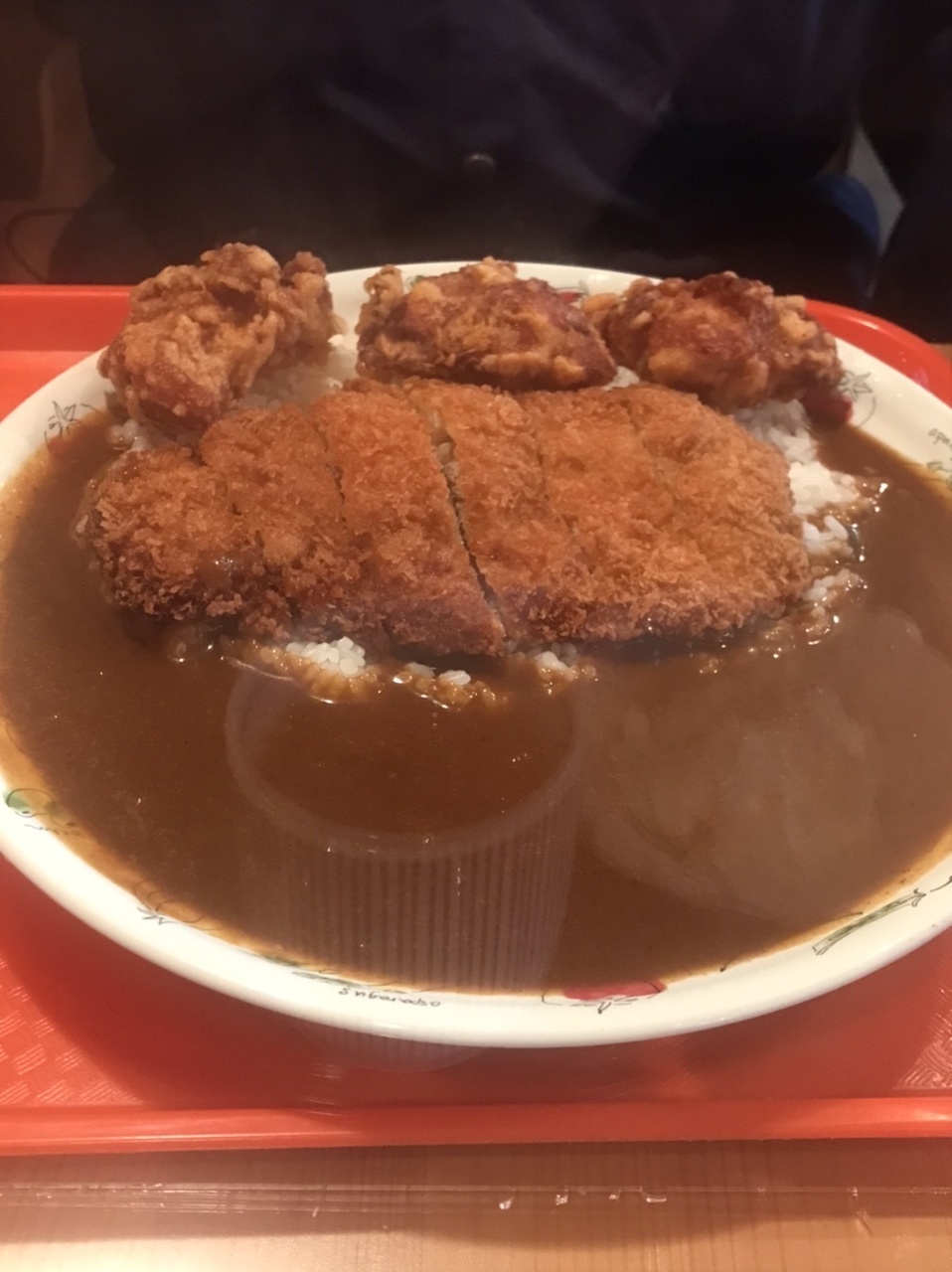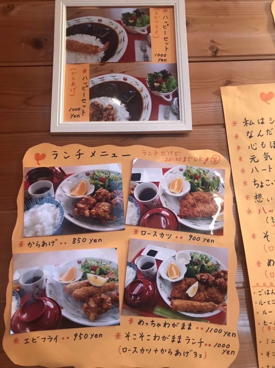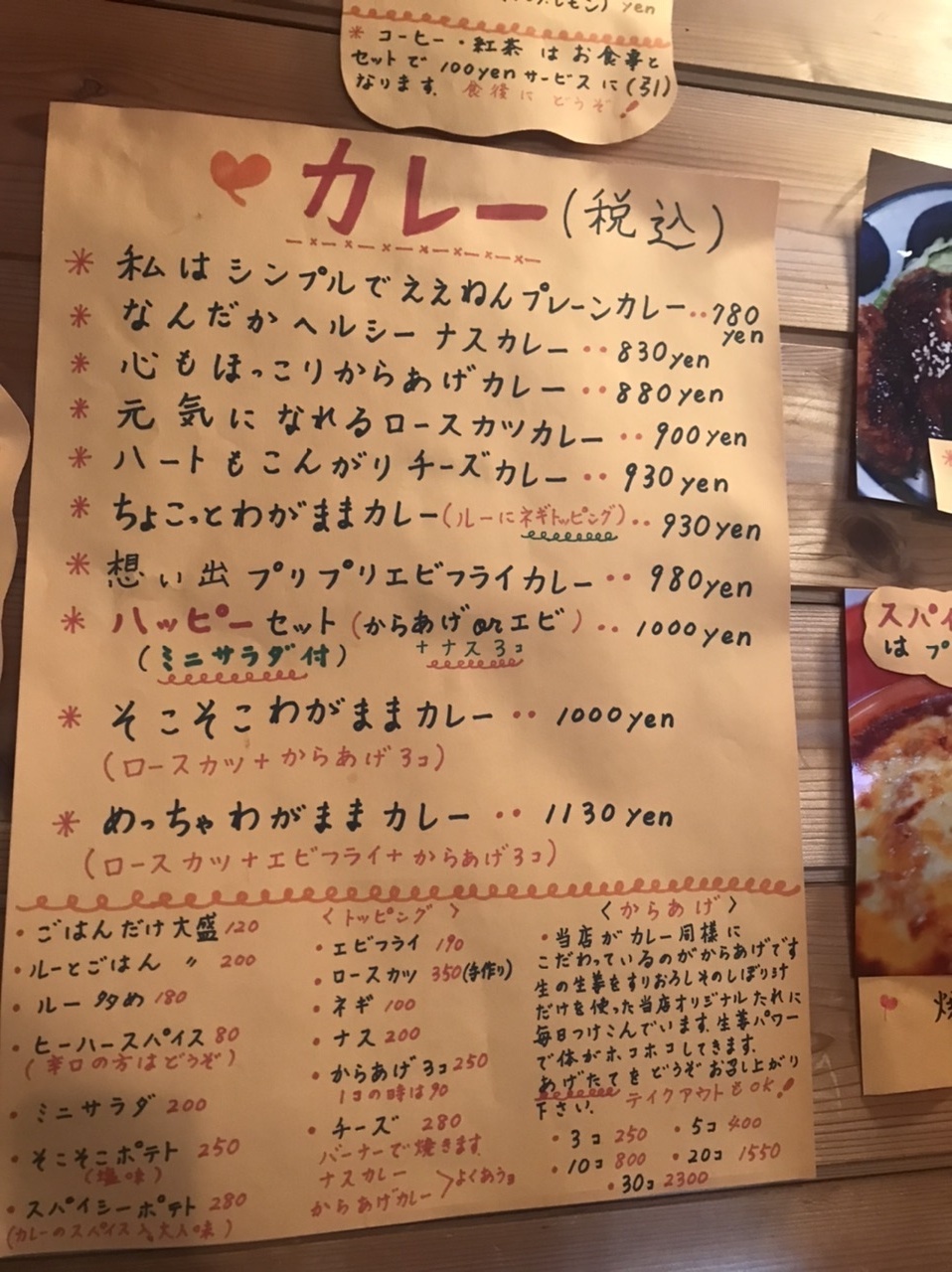 大阪の泉佐野市にあるカレーの店です。車で走っていると道路脇に手書きの怪しい看板を発見。車を走らせていくと店がありました。ログハウス風の店内はいい感じです。看板にあったソースロースカツ丼900円とそこそこわがままカレー1000円を注文。カレーはロースカツと唐揚げ3個が載っています。