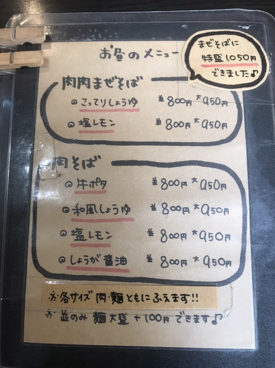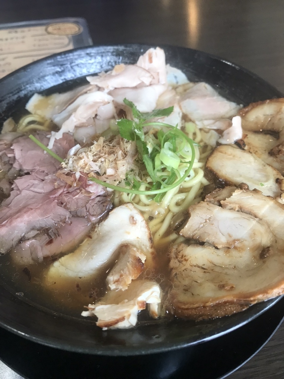 肉肉まぜそば(こってり醤油と塩レモン)と汁のある肉そば(牛ポタ、和風醤油、塩レモン、しょうが醤油)があります。和風醤油800円を大盛り150円増しで注文。ローストビーフ、ローストポーク、ローストチキン、焼き豚が載っていますが、どれもパサパサで残念。駐車場ありません。- 旅行時期