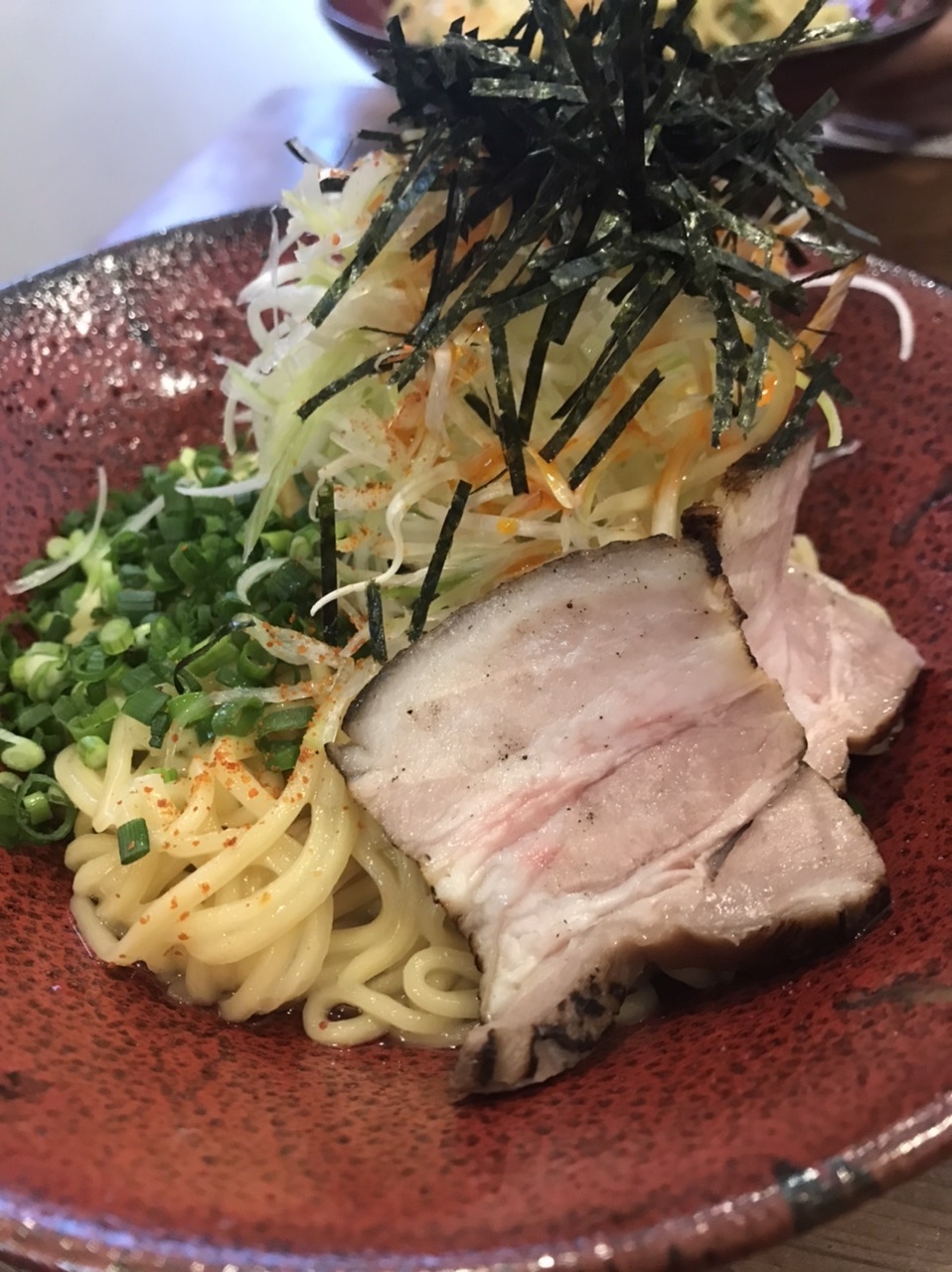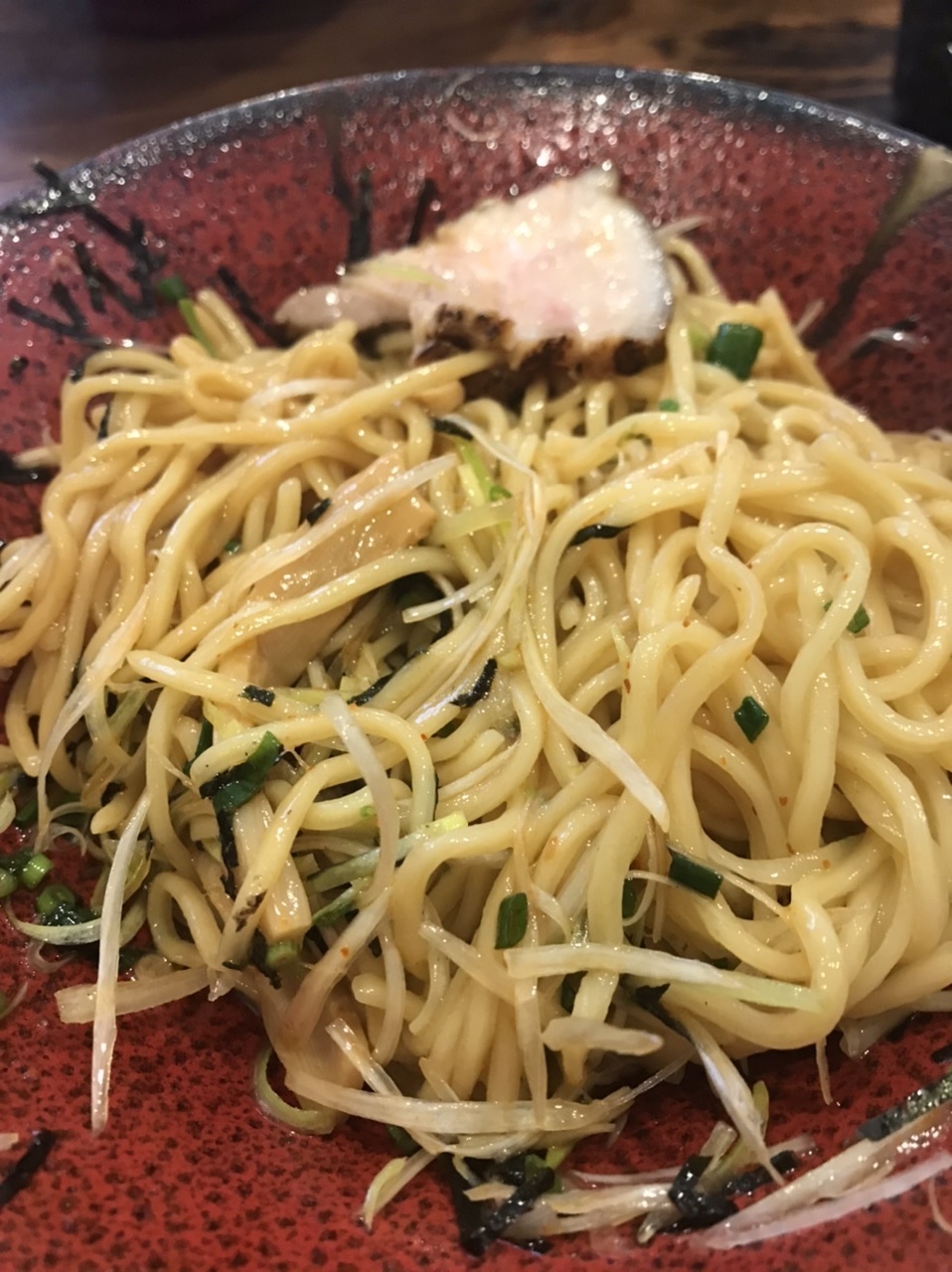 お洒落な店内です。油そば820円、麺大盛り100円。油そばは普通のラーメンよりスープが無い分、カロリーが半分以下とのこと。レアチャーシューが載っており、伊賀のもち豚を使用。麺は油そばなのでモチモチしています。ご飯が無料で付いてきます。塩ラーメンや海老そばもあります。駐車場はないですが、近くにコインパーキングあり。