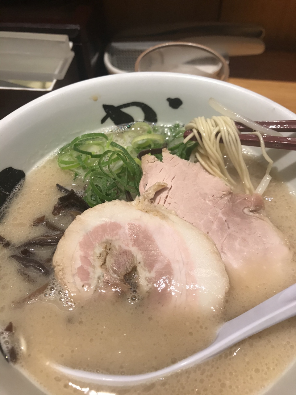 店の外から見ると小さな店かと思いますが、中はお洒落で広い店です。純とん、潮とん、純とんラーメン780円を注文。チャーシューは2種類。キクラゲともやし入り。麺は細麺で茹で加減を選べます。スープはあっさりしたとんこつです。ニンニクが置いてあるので、入れると合うと思います。スープだけで飲むといいですが、麺とはあまり絡まない感じで少し残念。