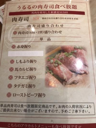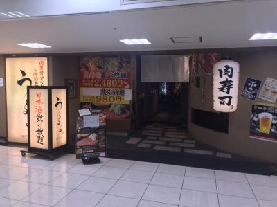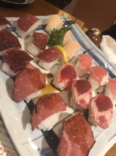 大阪の天満橋そばの、OMMビルの地下飲食店街にある肉寿司の店です。今回は5000円のコース。肉寿司等の料理の他、普通の飲み放題に加えて、日本酒が飲み放題です。梵艶純米大吟醸(福井)、獺祭(山口)、秋鹿(大阪)、天の戸(秋田)、くどき上手(山形)、初亀富士山(静岡)鳳凰美田(栃木)、初亀富士山(静岡)等16種の日本酒や10 種の焼酎も飲めます。肉寿司は、ローストビーフや霜降り、馬肉、たてがみなどがあります。料理も美味しくていい店です。1つ注文を付けるとすれば、店員さんにはもっと料理や酒の説明ができるように教育しておいてほしいです。