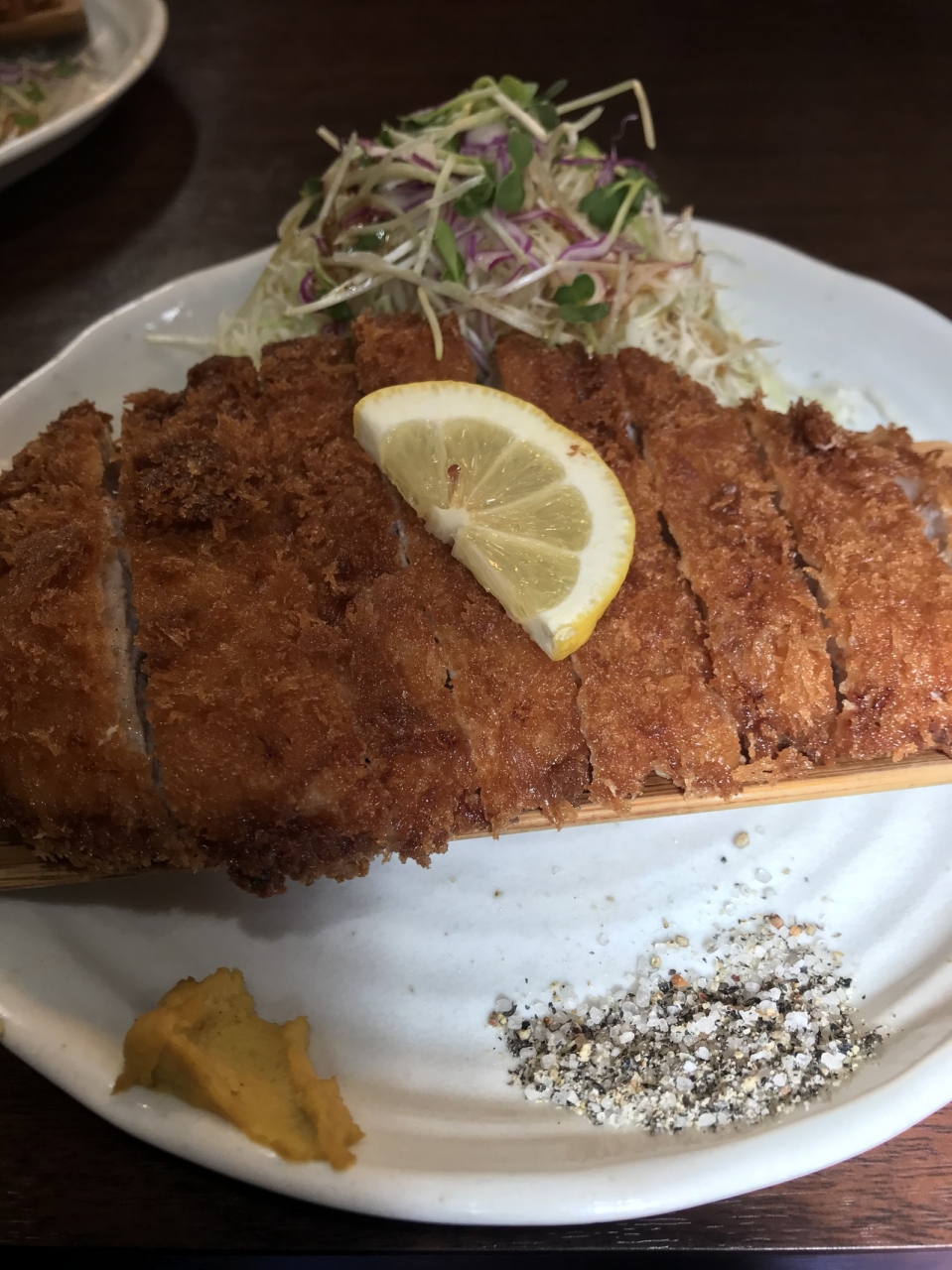 店内は26席ほど。11:00開店ですが、早めに行かないと昼は並びます。特選ロースかつ1400円を注文。だいたい1200円前後です。ここのとんかつは美味い!脂身が美味い!塩胡椒が付いてきますが、ソースよりもこの塩胡椒で食べる方が美味しいです。自分で取れるお惣菜も付いてきます。駐車場はありません。久し振りに美味しいとんかつ屋でした。