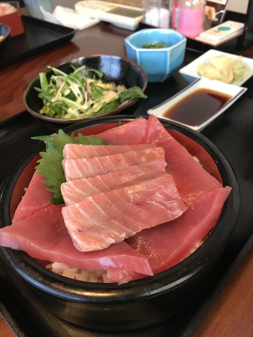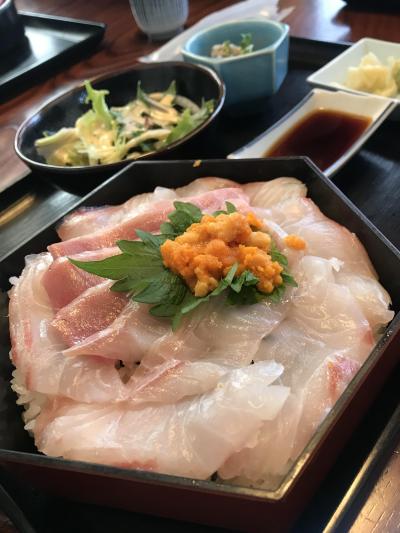 一軒家の寿司屋です。カウンター7席と座敷が2部屋がありますが、店は広くありません。ここの店は五島列島直送の魚が売りだそうです。刺身は1000〜1500円で、一品料理もお手頃価格です。丼は定食になっています。寒ブリ丼1600円、本マグロ丼1800円、五島地魚丼1620円を注文しました。マグロは赤身と中トロ?です。地魚は何かは聞いていませんが柔らかい白身魚とヨコワ?みたいなのにウニ。私としては寒ブリが一番良かったかな。料理が来た時に『少ない?』と思いましたが、十分お腹いっぱいになる量でした。他に小鉢とサラダと吸い物が付いています。