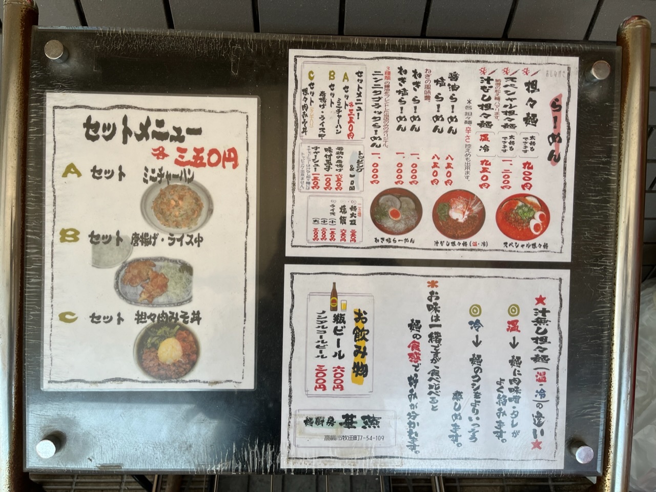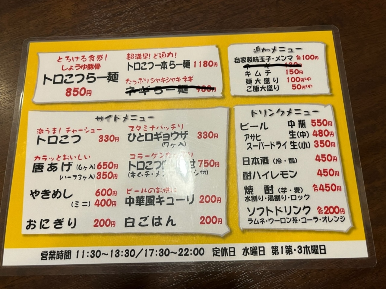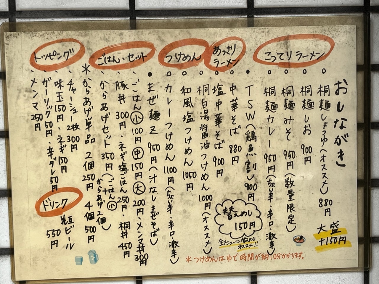 替え玉は150円です。昼のランチセットもあり、唐揚げ半チャーハンなどがあります。