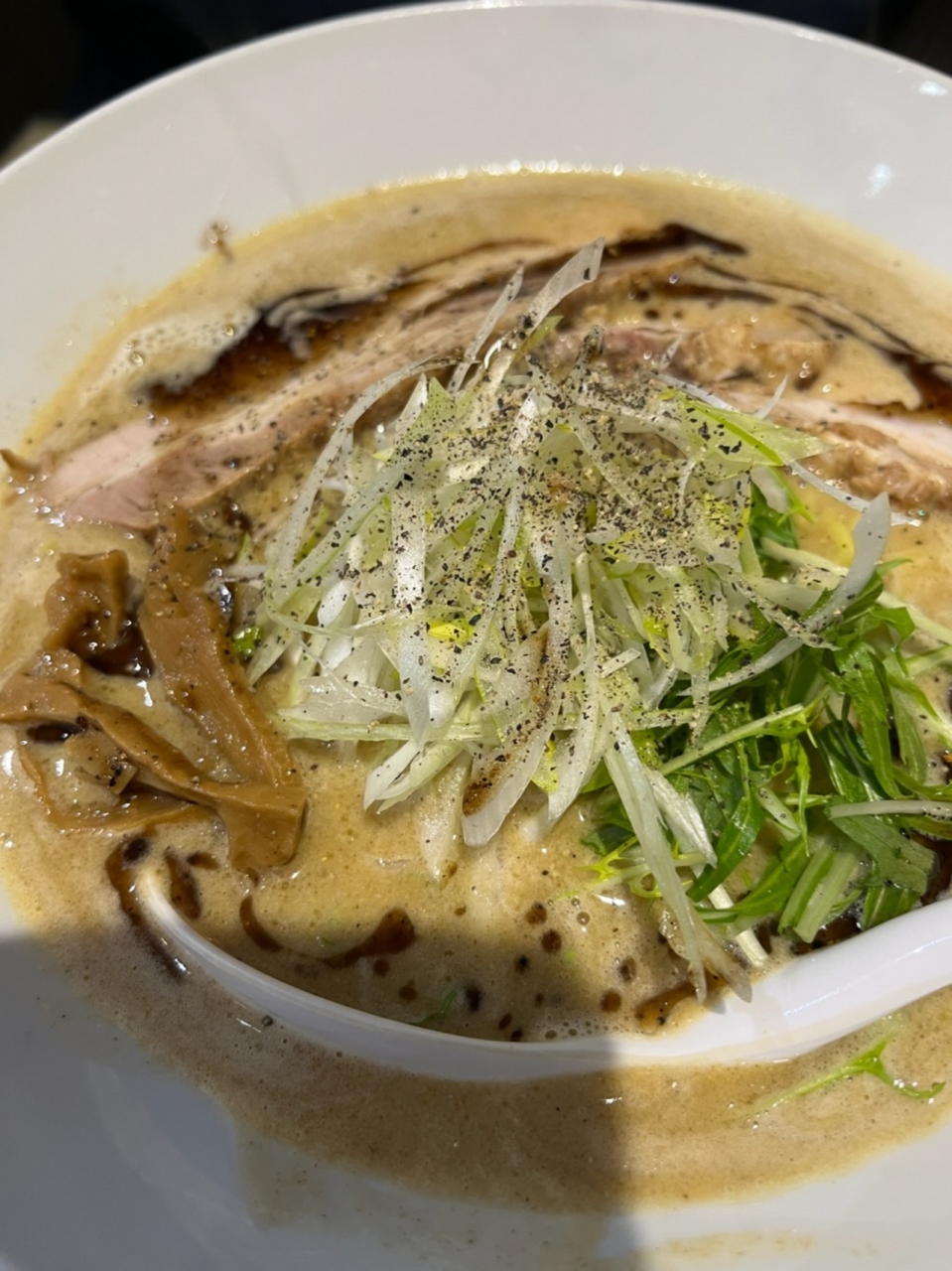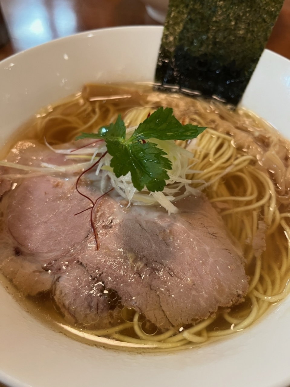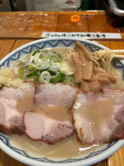 ラーメンは目の前に置かれた丼で仕上げてくれます。麺は細麺で、スープは、美味しいけれど、例えるなら上品な天下◯品みたいな感じ。でも、ニンニクを入れるとめちゃくちゃ美味しい!チャーシューは厚めで、これまた美味しい。人気店なのが納得です。