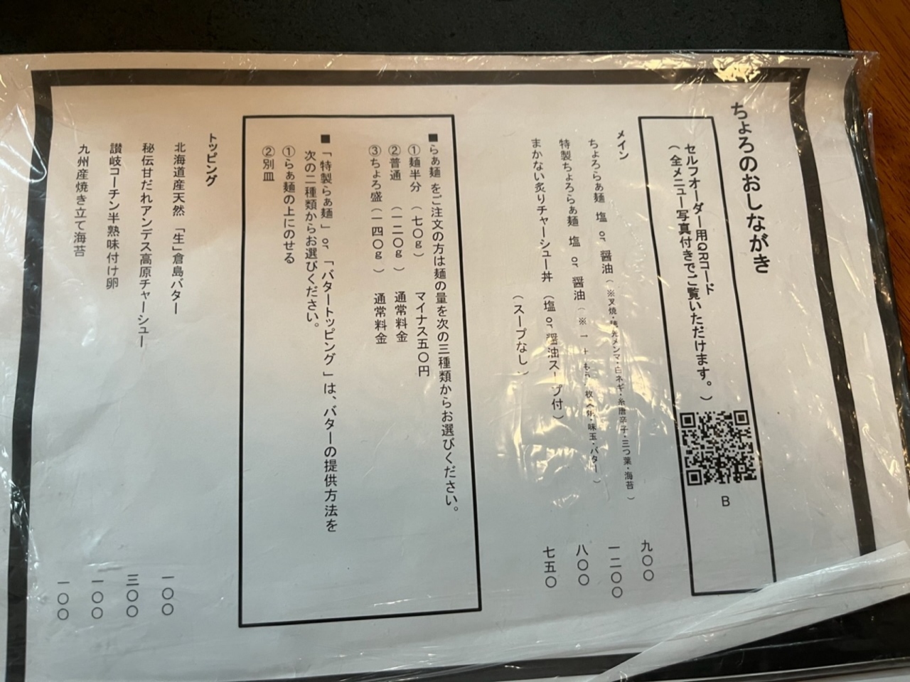 ちょろらぁ麺は醤油と塩があります。麺は少なめ(50円引き)、普通が120gで、ちょい盛は140gで料金そのまま。あと、チャーシュー一枚増量、あじあま、バターが付いた特製ラーメンもあります。特製ちょろらぁ麺醤油900円を麺ちょい盛で注文。すっきりした綺麗なスープはあっさりしていて美味しく、ストレート麺に合います。チャーシューは柔らかすぎてポロポロに崩れるので、そこまでしなくともという感想。店内はおしゃれです。