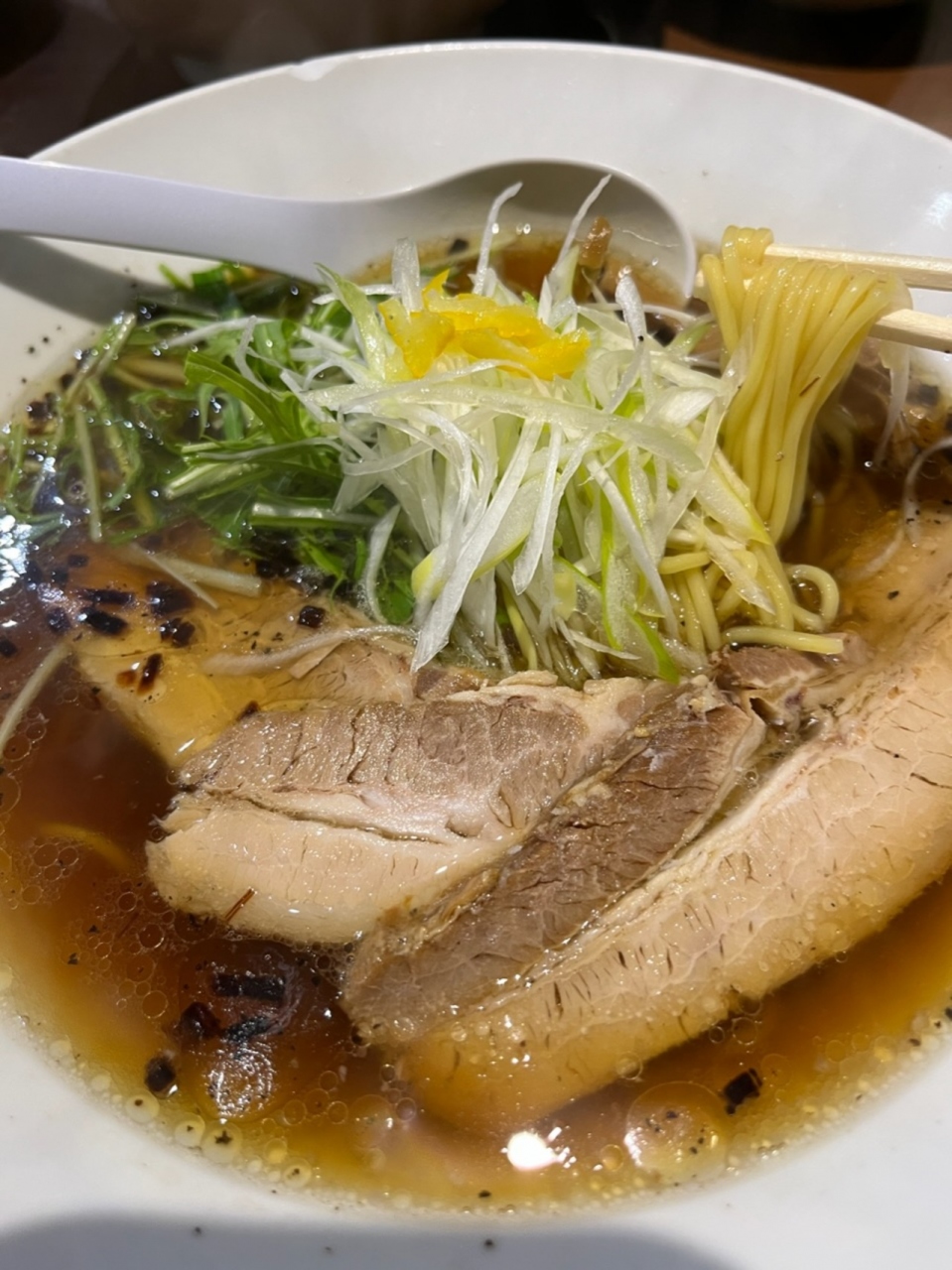 旭区の千林商店街近くにあるラーメン屋さんです。商店街から横道に逸れるのでわかりにくい場所にあります。中華そば(醤油、味噌、塩)の他、鶏白湯、坦々麺、つけ麺があります。中華そばの醤油750円を注文。想像していた味とは違い、スープはすっきりしており、醤油の味がよくわかります。魚介やとんこつの味ではないので、おそらく鶏ガラ?。白ネギと水菜が載っており、シャキシャキして美味しいです。焦がしネギと柚子がいい感じです。チャーシュー
