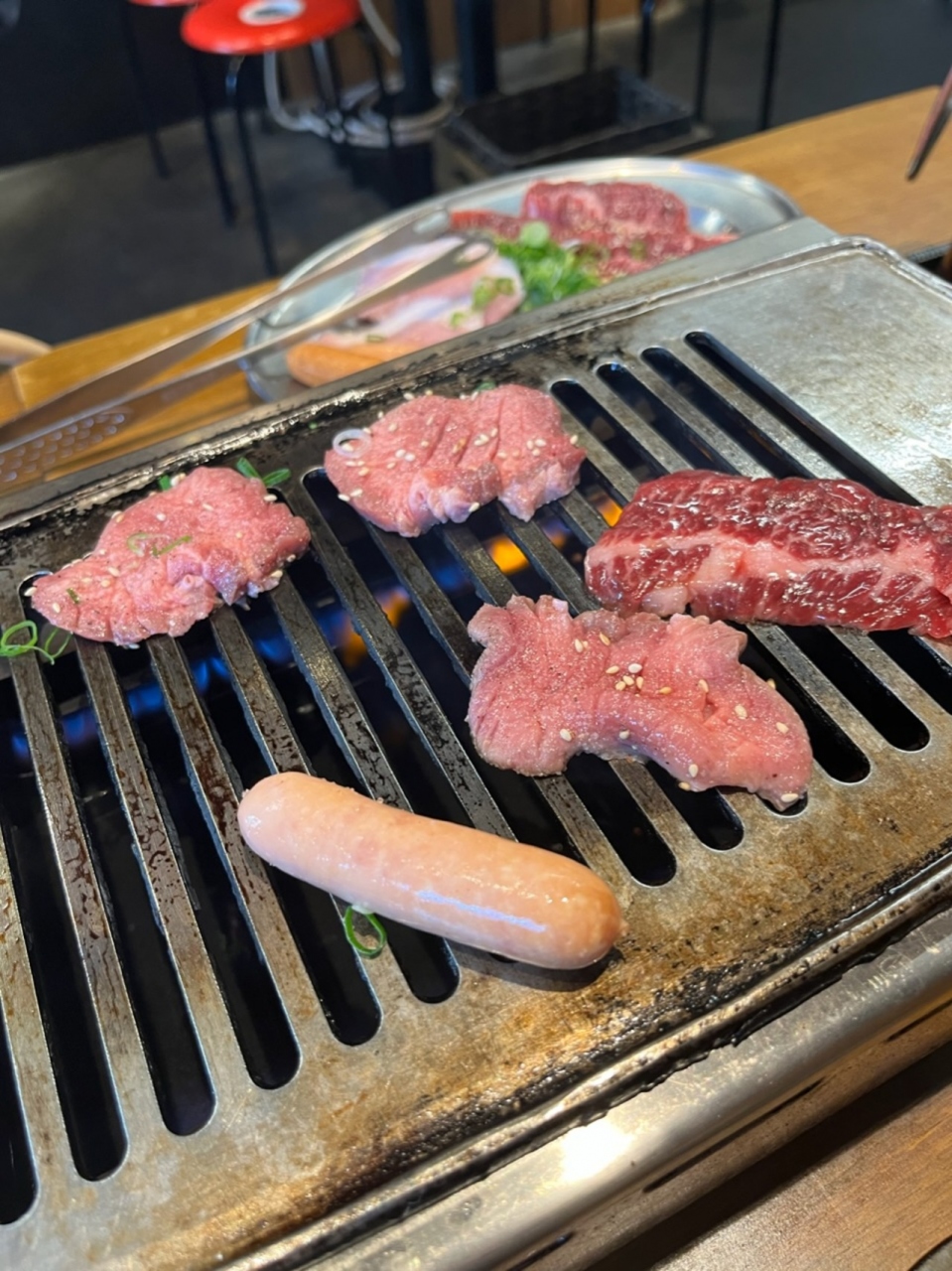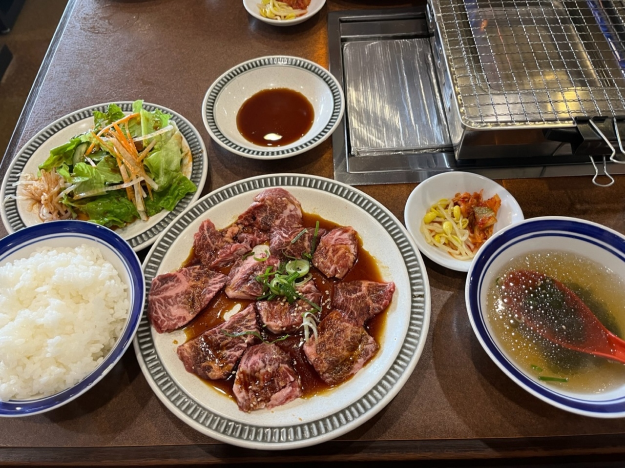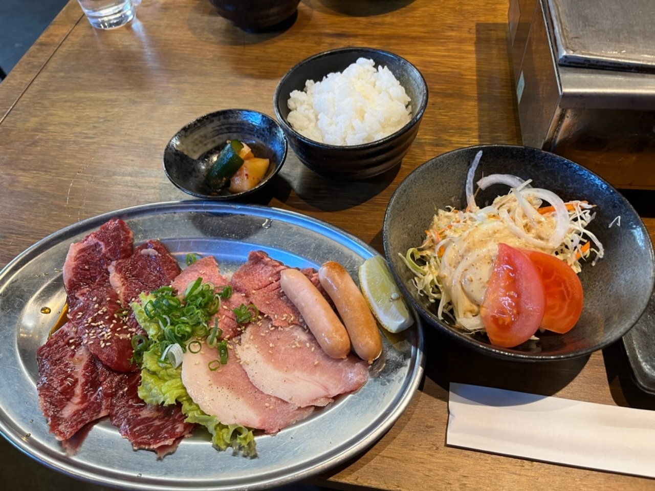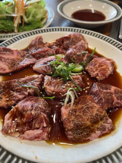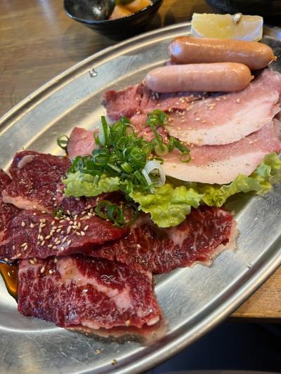 城東区の蒲生の『城東商店街』内にある焼肉屋さんです。こちらではランチメニューがお得です。土曜日のランチで利用。土日限定の焼肉ランチ1540円を注文。ロースターで焼いて食べます。タレはポン酢、味噌ダレ、醤油ダレの3種類。個人的には醤油ダレが一番好きです。肉は、赤身、豚トロ、タン、ソーセージ。美味しいのですが、少し量が少ないかなあ。サラダとご飯、ワカメスープ、キムチが付きます。駐車場はありませんが、すぐ近くにコインパーキングがあります。