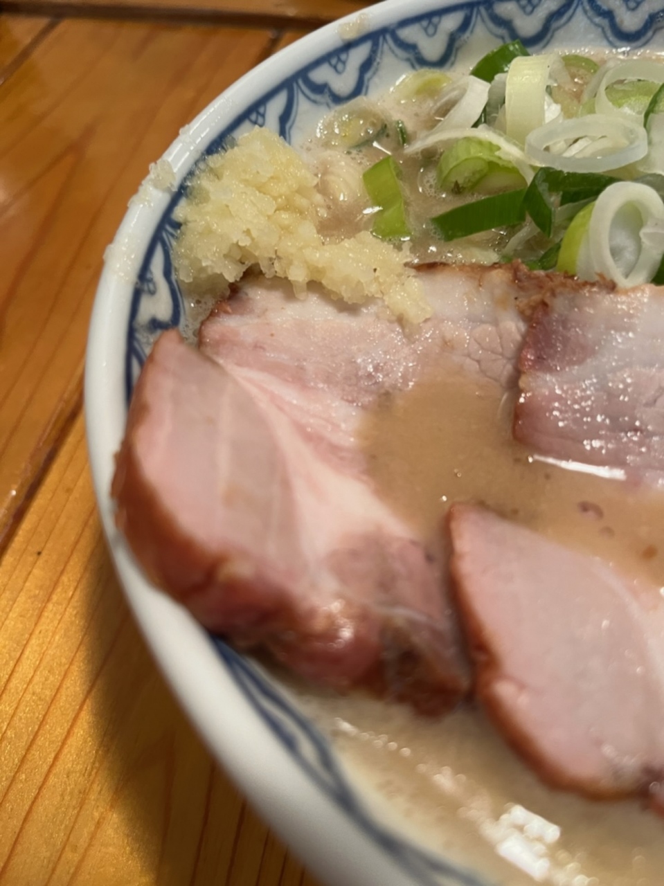 メニューは、ラーメン、特製ラーメン、ねぎラーメン、つけ麺のみ。特製ラーメン1100円を大盛り100円増しで注文。にんにくが合うとのことなので、にんにくも入れれてもらいます。普通のラーメンのチャーシューは塩煮豚ですが、特製は三河もち豚石窯チャーシューです。