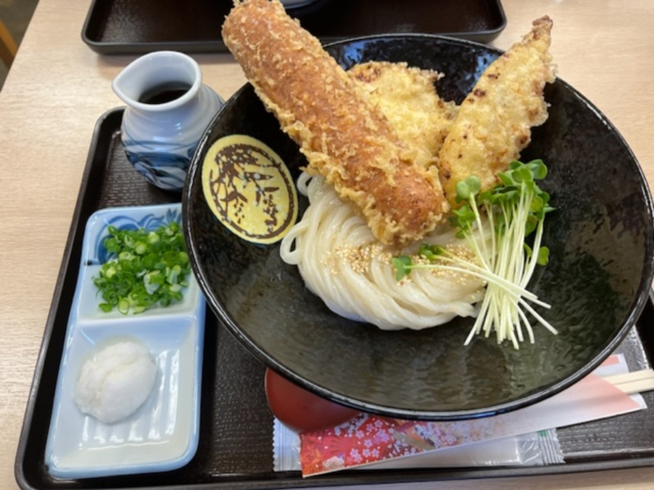 京阪滝井駅直近にあるうどん屋さんです。鶏天カレーうどんが名物とか。鶏天ちくわのぶっかけ990円を注文。とり天が2個と大きなちくわ天が1つ載っています。とり天は胸肉ですが柔らかくてしっかりとした味が付いています。天ぷらはどちらもサクサクで美味しいです。麺は予想に反してそれほど強いコシではなく、モチモチした感じです。出汁もすっきりしています。大盛りは1.5玉で400円増し。季節や数量限定で、梅尽くしあんかけうどん1280円や辛口麻婆茄子うどん1380円などの変わったうどんもあります。隣の席の人が頼んだ温かいうどんの出汁のいい臭いがこちらまで漂ってきたので、次回は出汁を頼んでみます。2020年のうどん百名店に選ばれています。駐車場はありませんが、近くにコインパーキングがたくさんあります。