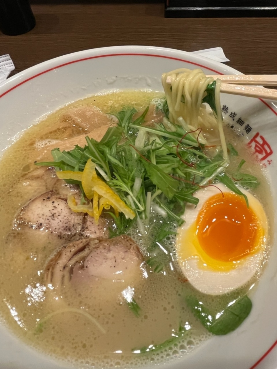 京都の八坂神社近くにある白湯系のラーメン店です。醤油、鶏しお、あごだし、味噌ラーメン等があります。鶏しおらぁ~めん830円を注文。チャーシュー3枚とメンマ、玉子、水菜に加えて柚子が載っています。麺は細麺で、スープはしっかりとした塩味で、ややこってり気味。若者に人気な店みたいです。