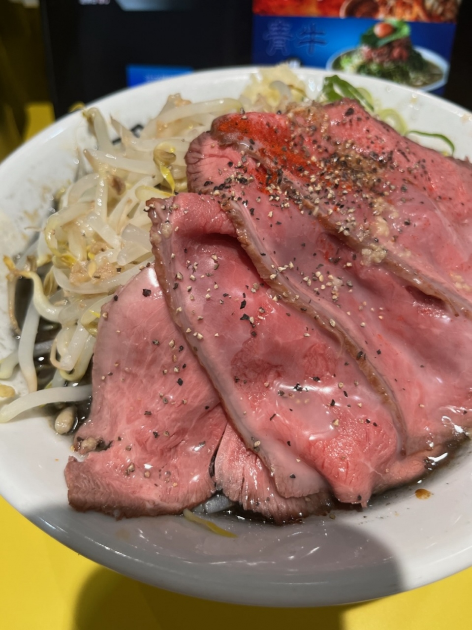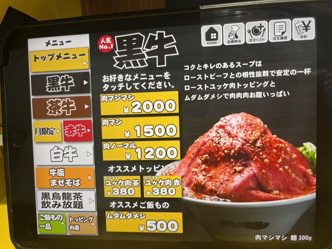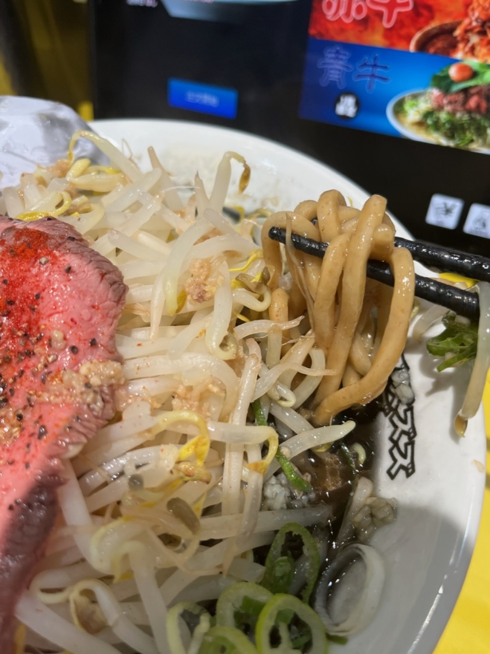 ローストビーフの黒牛、肉の量が最も多い甘辛ローストユッケ肉の茶牛、白味噌ベースの白牛などがあります。黒牛の肉ノーマル1200円を注文。麺の量は300gまで同料金でいけます。肉はマシマシ注文すれば2000円です。麺は極太麺で食べ応えがあって美味しい。スープは黒牛だけあって表面は真っ黒ですが、中は普通に茶色です。二郎系みたいな味です。ローストビーフはノーマルでも5枚載っているため、マシマシにする必要はないですが、写真映えさせたければマシマシにしたらいいと思います。ローストビーフ自体にあまり味がないので、個人的にはチャーシューの方がいいです。極太麺のため、出来上がりに時間がかかります。