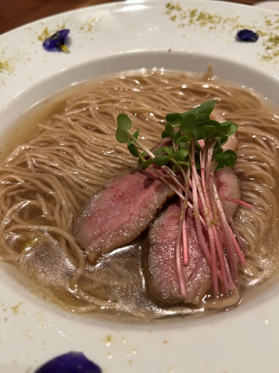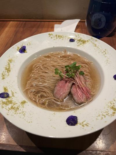 メニューは、ラーメンとつけ麺がメインで、他にも鴨の出汁で炊いたご飯とかあります。とりあえず、ラーメン1080円を大盛り100円増しで注文。石臼で引いたドイツ産ライ麦の麺とのことで、コシはあまり強くなく、ブチブチ切れる感じの食感。鴨肉はロースとももから選べます。鴨はロースで注文、柔らかくてローストビーフの様な感じでとても美味しい!スープは、他では味わったことのないすっきりとした鴨と昆布の出汁が効いています。器の縁にブドウ山椒が付いており、好みに合わせて汁に入れますが、なしでも十分美味しい。つけ麺は鴨と白湯のつけ汁とのこと。平日の昼に訪問しましたが、11:00開店で、11:15には席が埋まりました。一つ注文をつけるとしたら、店員さんの説明が長いことですが、なかなか他とは雰囲気の異なった良い店です。- 旅行時期