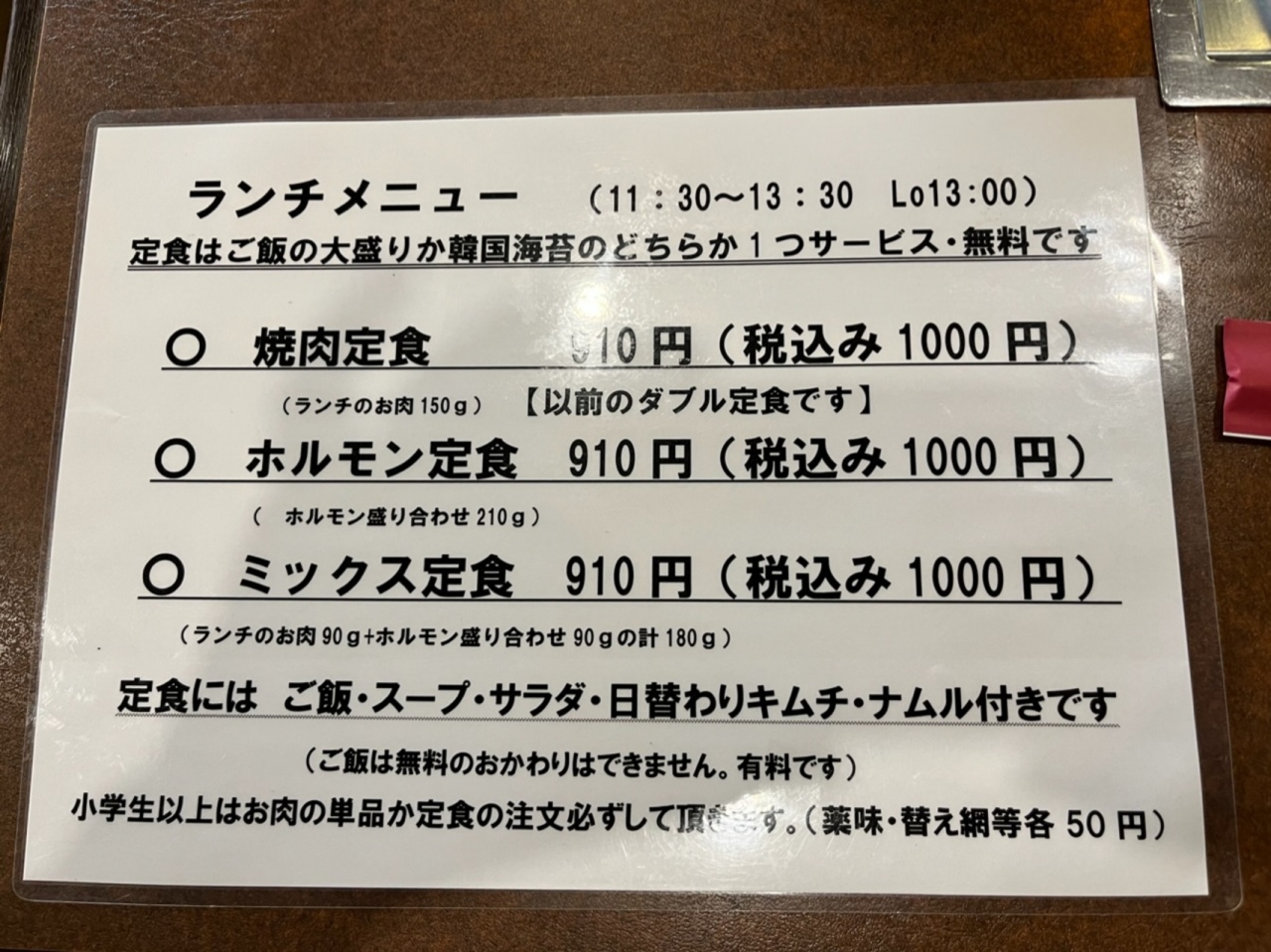 東大阪市にある焼肉屋です。ランチで利用。焼肉定食、ホルモン定食、ミックス定食いずれも、税込1000円!。定食は、ご飯の大盛りか韓国海苔が付きます。焼肉定食を注文。ハラミだと思いますが、肉は一切れがやや小さいですが柔らかくて美味しいです。特にタレが美味しいです。1000円でこれなら十分満足できる店です。