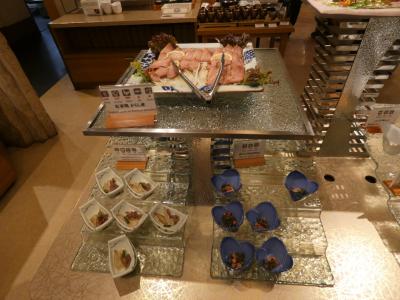 夕食はバイキング。品数も多く、どれも美味しい。寿司や刺身ははこれまでのホテルの中では一番種類が多く、ステーキもどこのホテルよりも柔らかく、焼き加減も良い。席に案内してもらう時に、従業員の方がシステムや場所について説明してくれるのも良かった。