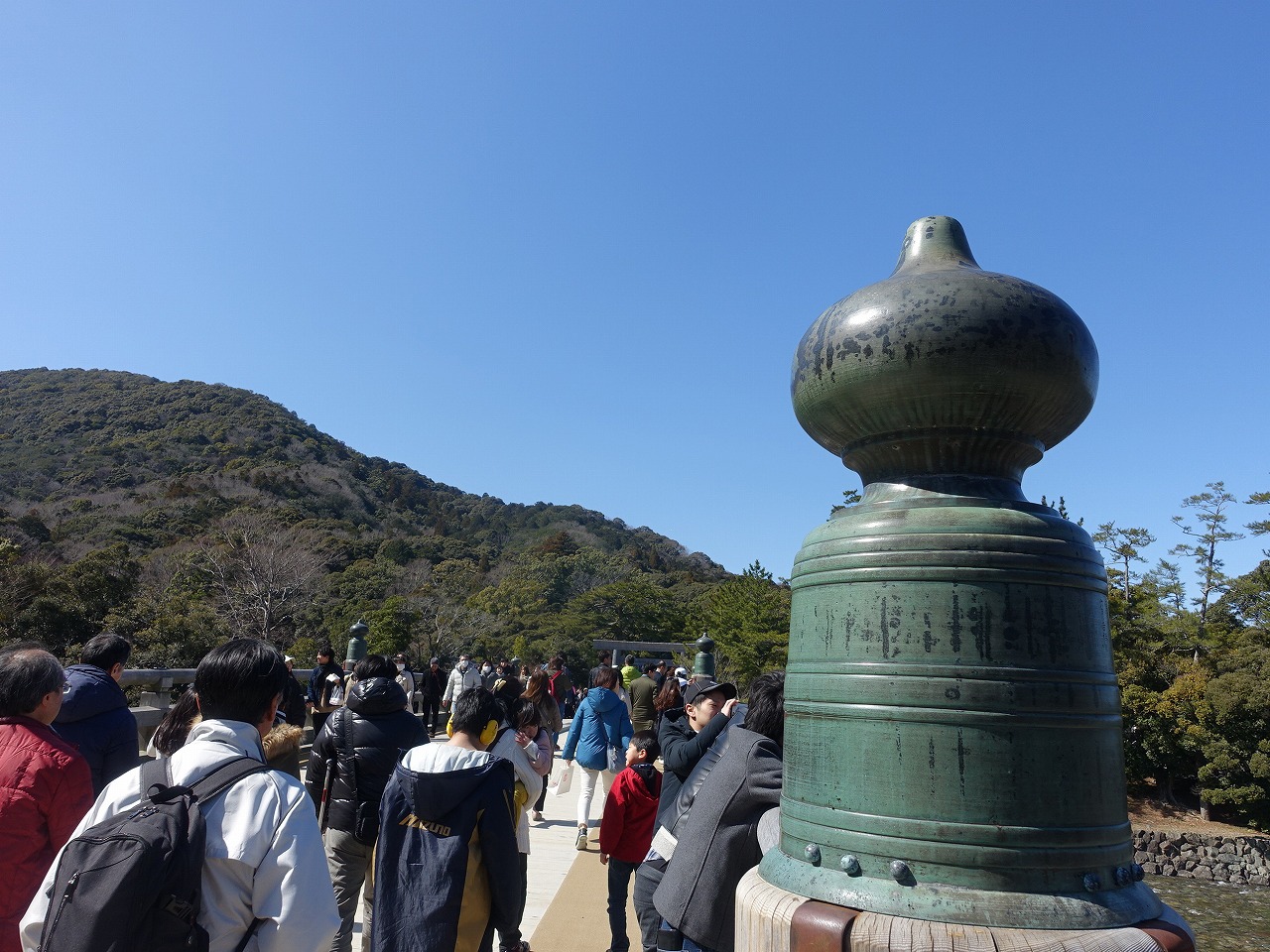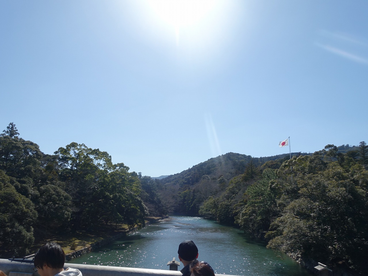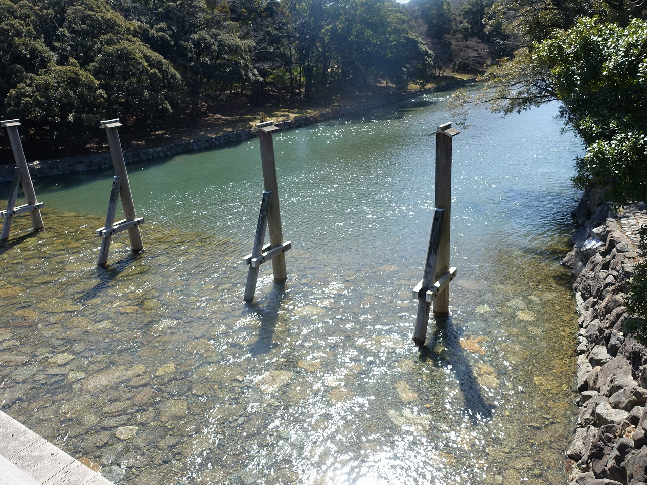 伊勢神宮の鳥居をくぐるとすぐにこの橋になります。きれいな五十鈴川に掛かる木製のこの橋は、伊勢神宮の象徴と言えるのではないでしょうか。この橋を渡りながら眺める五十鈴川はとてもきれいです。写真の撮影スポットです。