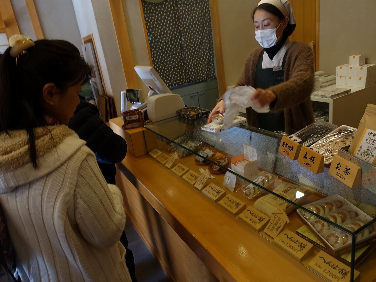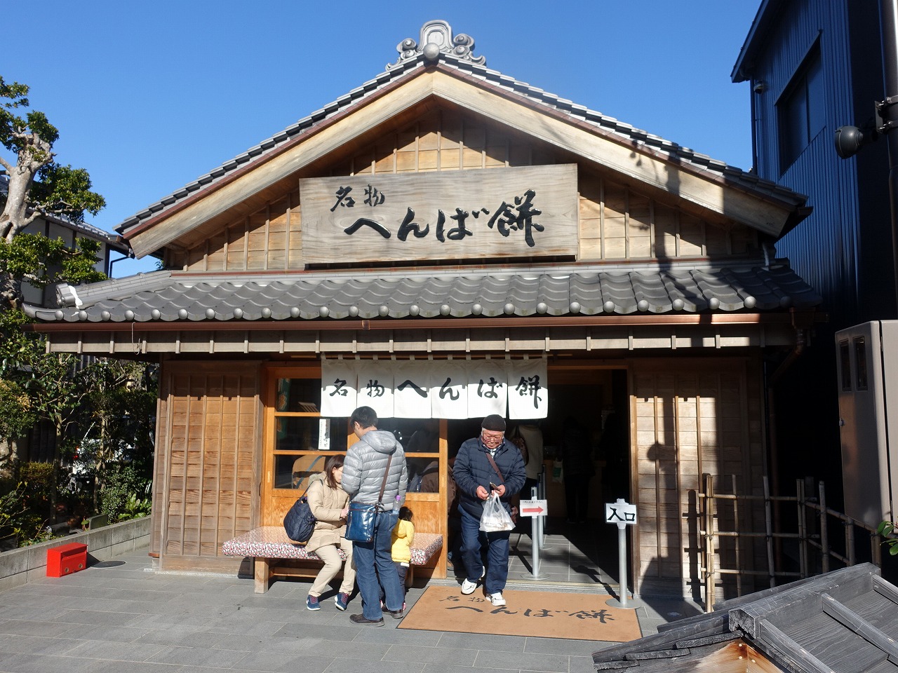 伊勢の名物といえば赤福が有名ですが、ここのへんば餅も実は隠れた有名名物です。軽く焼いた餅で、中にはあんこが入っています。店内で食べるとお茶が付いてきます。へば餅も美味しいですが、さわ餅というあんこの餅もあり、私はこちらの方が好きです。店は結構混んでいます。