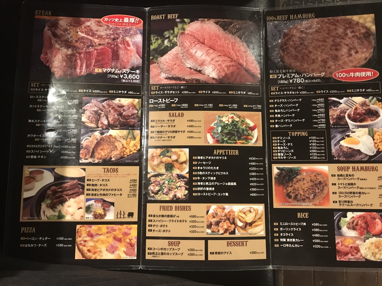 JR中野駅近くにあるステーキの店です。ここでは3650円でステーキ等が食べ飲み放題できます。ステーキやハンバーグは美味い!何よりここの目玉は『マグナムステーキ』。720gの超デカイステーキ!見た目のインパクトはすごい!しかし、肉はパサパサしてるので、普通のステーキの方が美味いかな。インスタ映えはしますね。