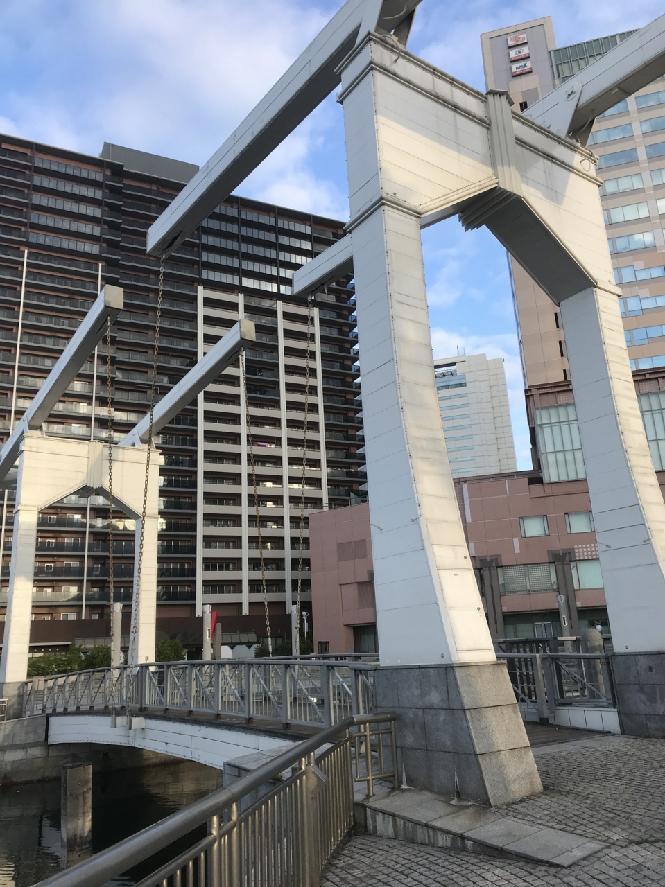 神戸のハーバーランド公園にある『はねっこ』という跳ね橋です。この跳ね橋は実際に中央付近から跳ね上がるようになっているらしいです。それほど大きな橋ではありませんが普通に撮ることもできます。訪れたのが朝だったので足は閉じたままでしたがいちど跳ね上がっているところ見てみたいです。