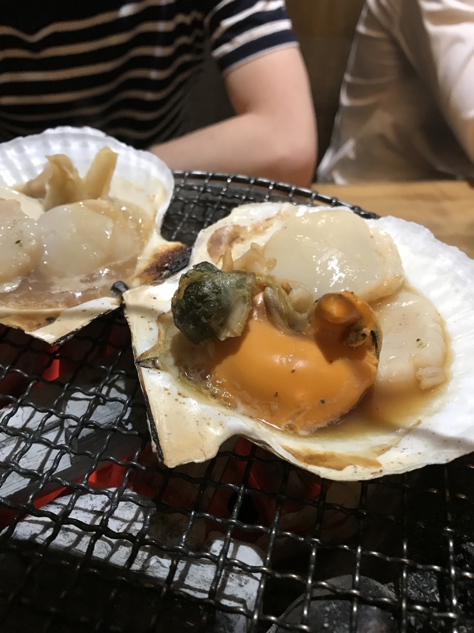 梅田の堂山町にある海鮮焼の店です。4000円のコースを注文。先付、ホタテ、魚三種、ソーセージとベーコン、鶏肉、野菜、玉子かけごはん、デザートで飲み放題でした。ホタテは生でも食べられるくらい新鮮で美味しいです。