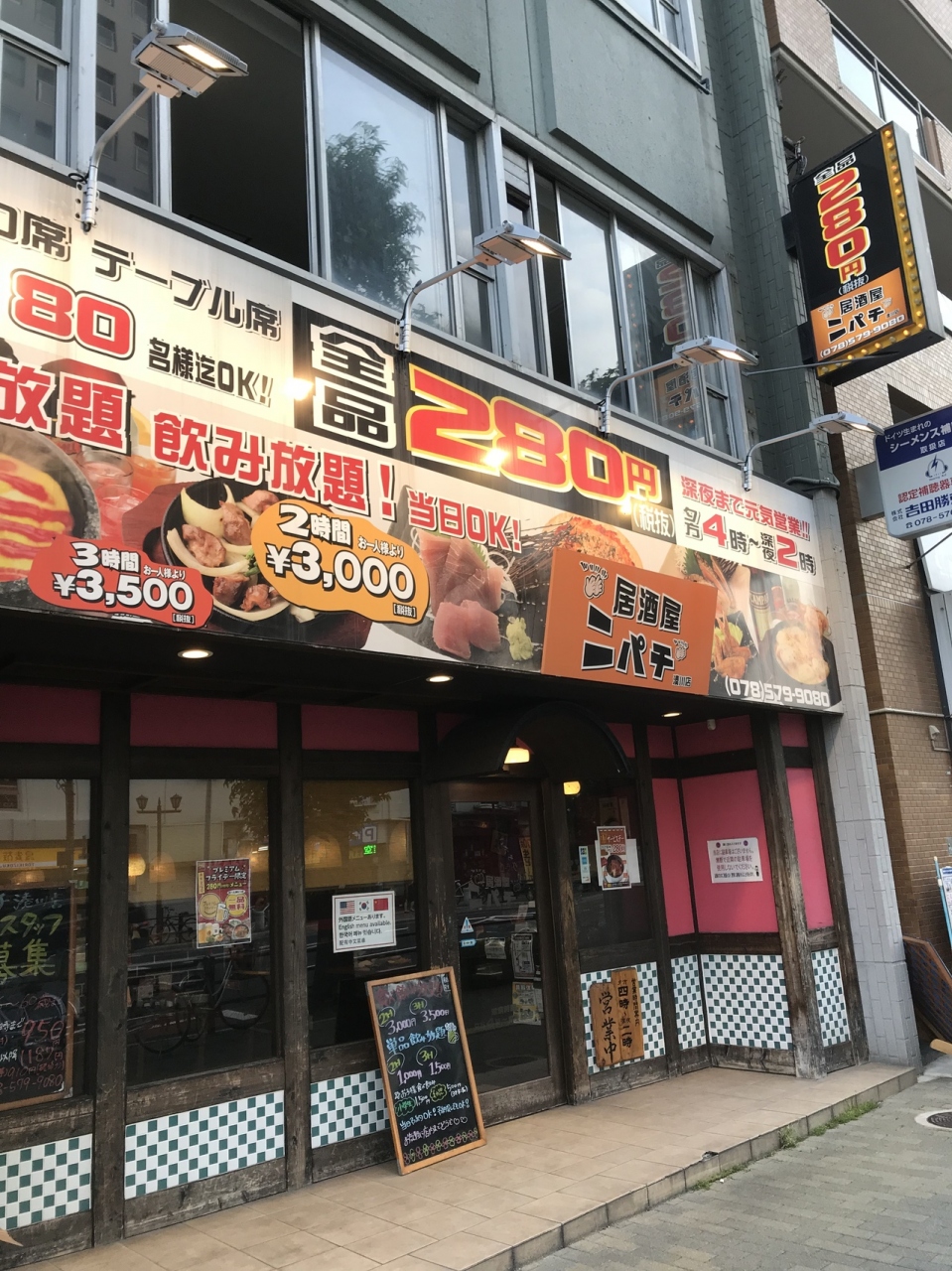 神戸の地下鉄湊川駅近くにあるチェーン店の居酒屋です。2時間食べ飲み放題で一人3000円コースがありますが、そらよりも2時間1000円飲み放題がお得です。メニュー、注文はタッチパネルで、料理も比較的すぐ来ます。大勢で行くなら飲み放題だけにして、料理は単品の注文にすると、食べ放題にするよりお得です。