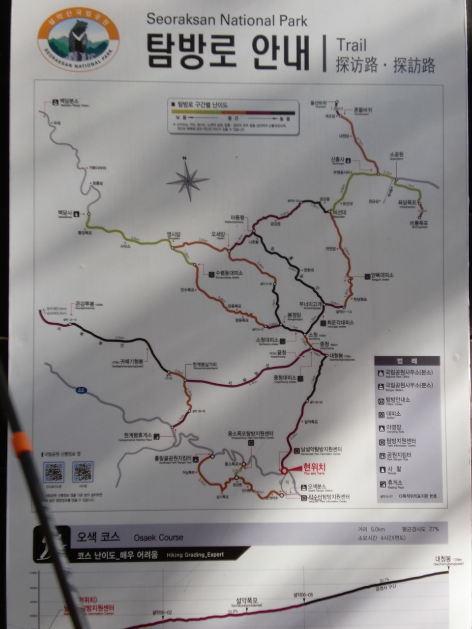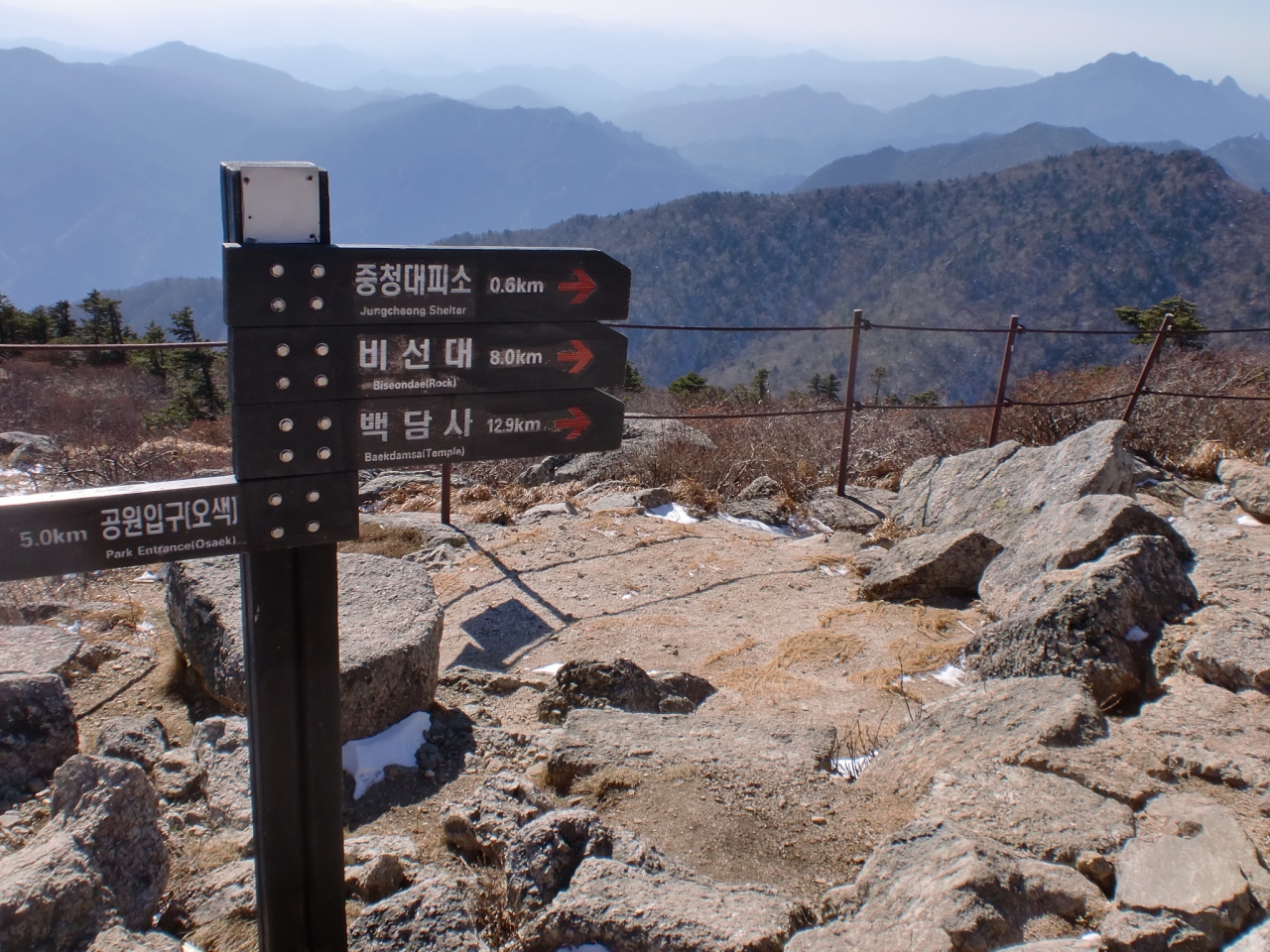 韓国で高さ3番目の雪岳山、雪岳山の最高峰、大青峰(テチョンボン、1708m)に登ってきました。登山ルートは、北側からケーブルカーに乗るコース、南側(五色)からひたすら登って行くコース等がたくさんあるようです。