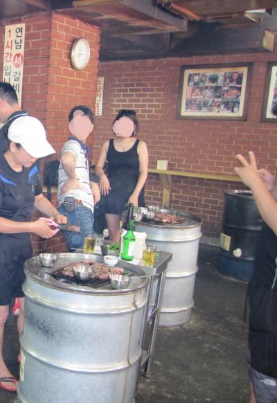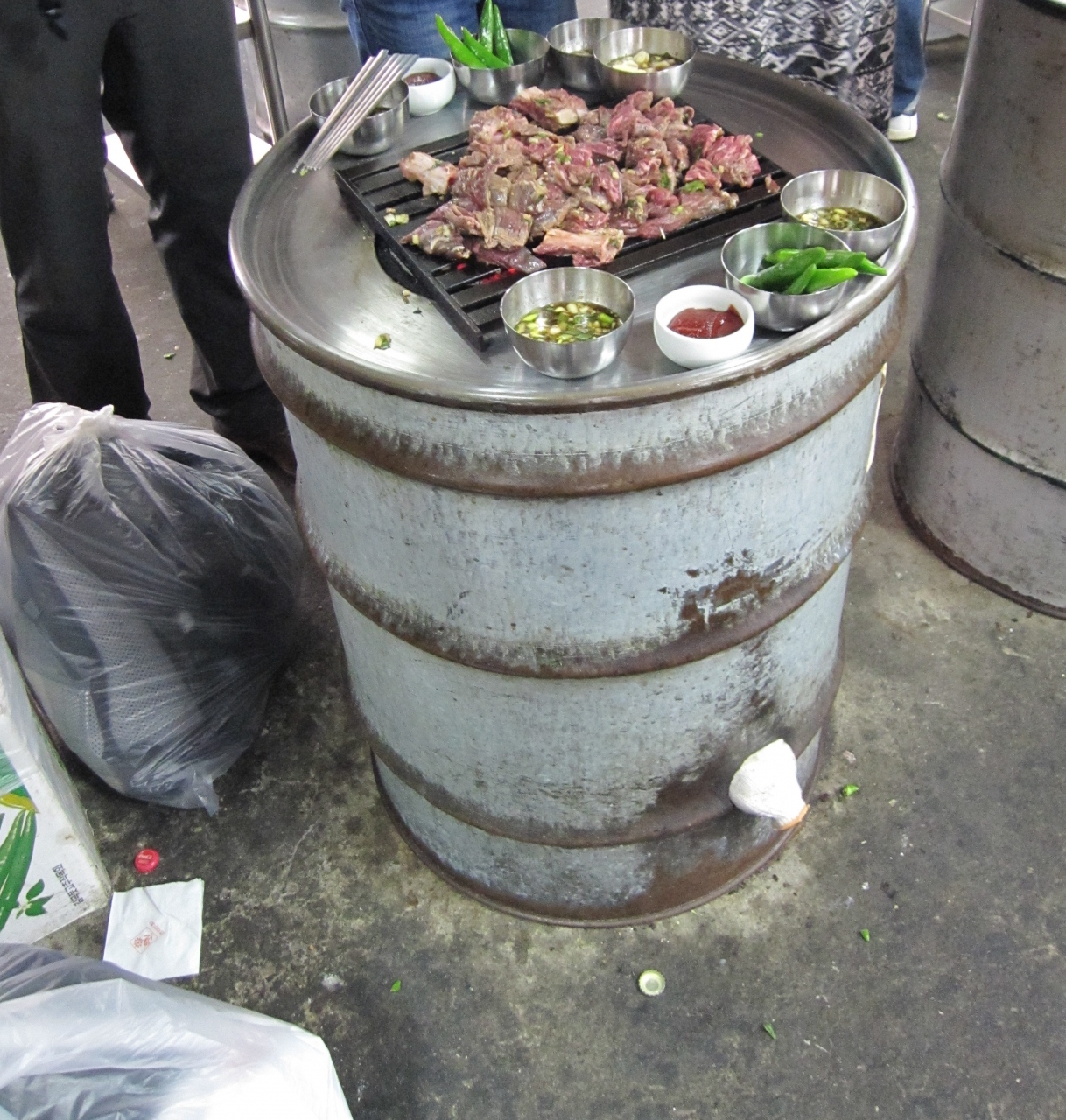 立って、ドラム缶(の上)で肉を焼いて、食べるお店。