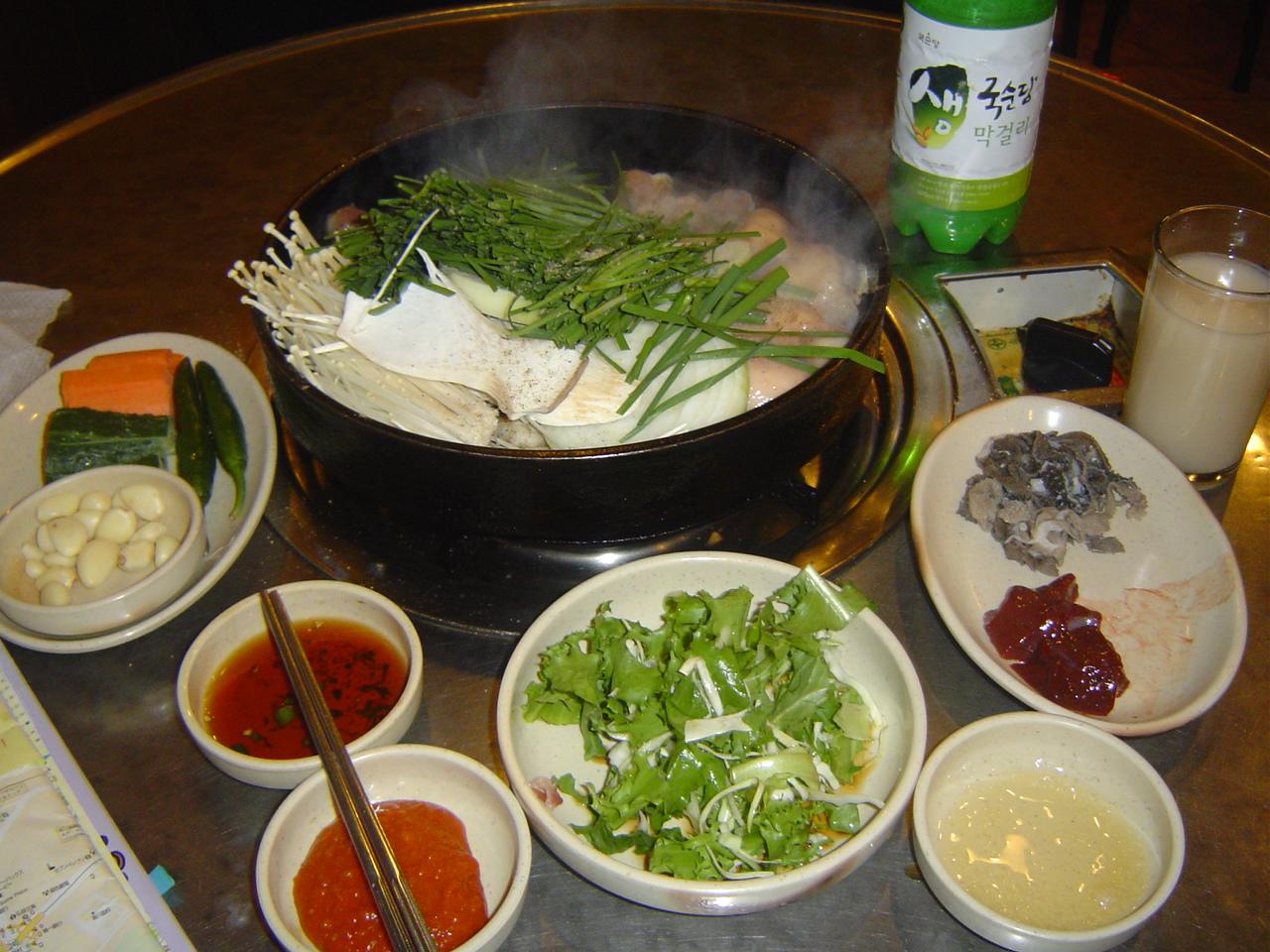 店に入ると奥の座敷にはお客さんがポツポツ居たので、テーブル席に座りました 。「忙しいから、ぼちぼちマッコリ飲んで待っててね」みたいなことを言われた、その時の写真です。