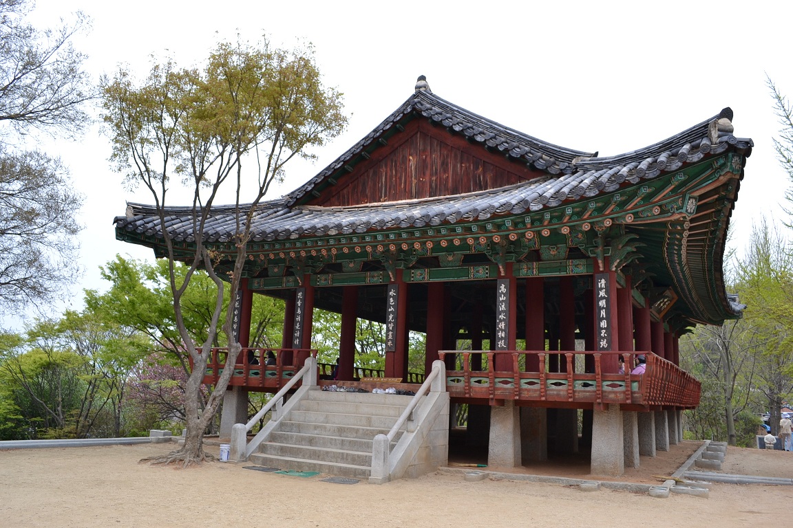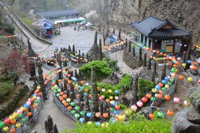 バス停付近に案内所があり「歩いて約30分でタプサに行けます」と親切に教えてくれました。入場料2000Wを払って、お土産・お食事処を抜け、桜が咲いている湖畔をのんびりとお散歩してタプサに到着しました。