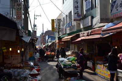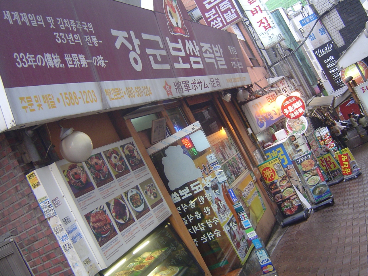 場所が分かりにくいので、地図は必携です。大きめの通りから路地を25m位入った角です。(写真の右奥がその通りです、メニューに日本語が書いてあり安心です、アジュマも親切でした)- 旅行時期
