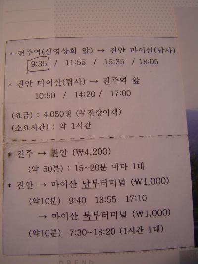 全州→鎮安(ジナン)→馬耳山(マイサン)とバスを乗り継いでいくのが一般的のようですが、全州駅の観光案内所で、「全州駅←→マイサン南部駐車場」の楽ちんバスを教えてもらいました、1日4便(帰り3便)と少ないけど、3900Wと安くて便利でした。
