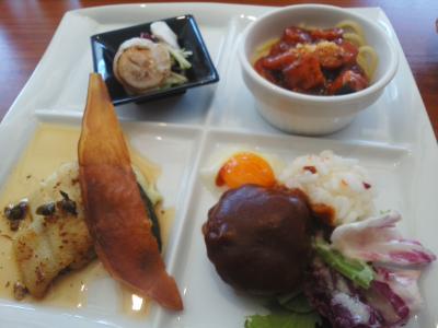 1階のレストランで、ランチを食べてきました。魚か肉のランチを選択して、パン、サラダ、ドリンク、フルーツ、デザート、ご飯、おかず等をブッフェスタイルでいだきました。コース料理や松花堂弁当、カレー等もありました。