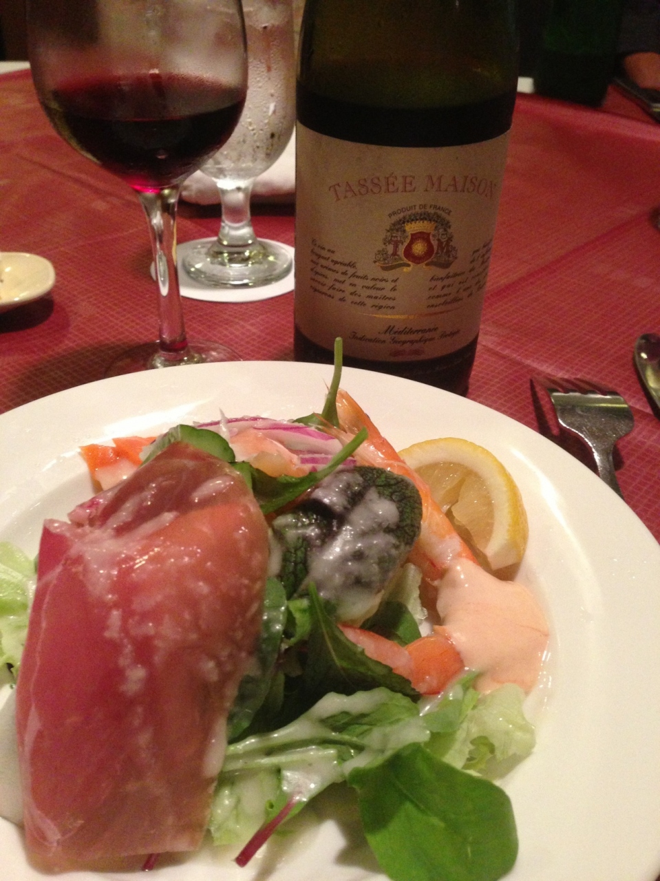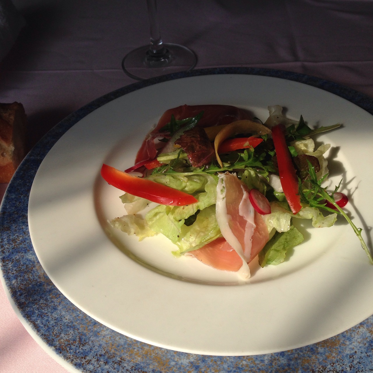 まずバゲット。このバゲットとバター美味しいです。バターが良いのか進みます。サラダもgood